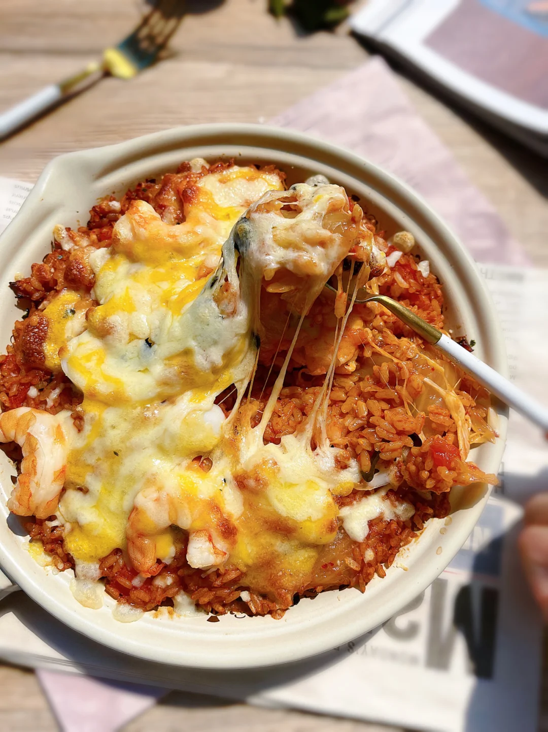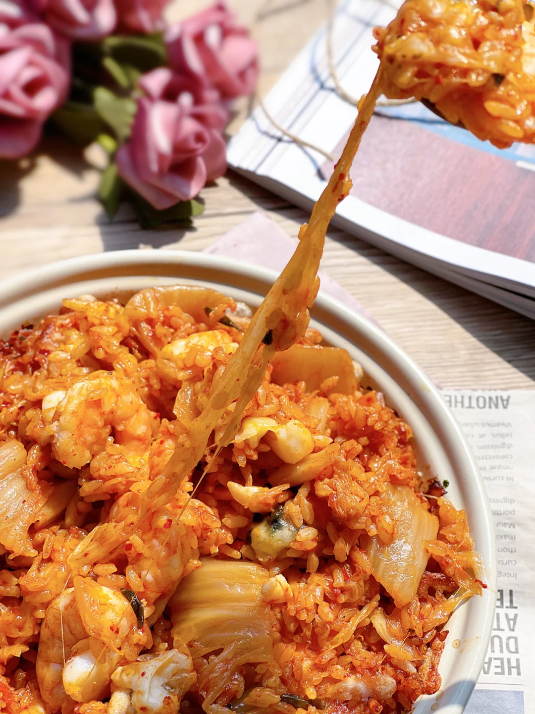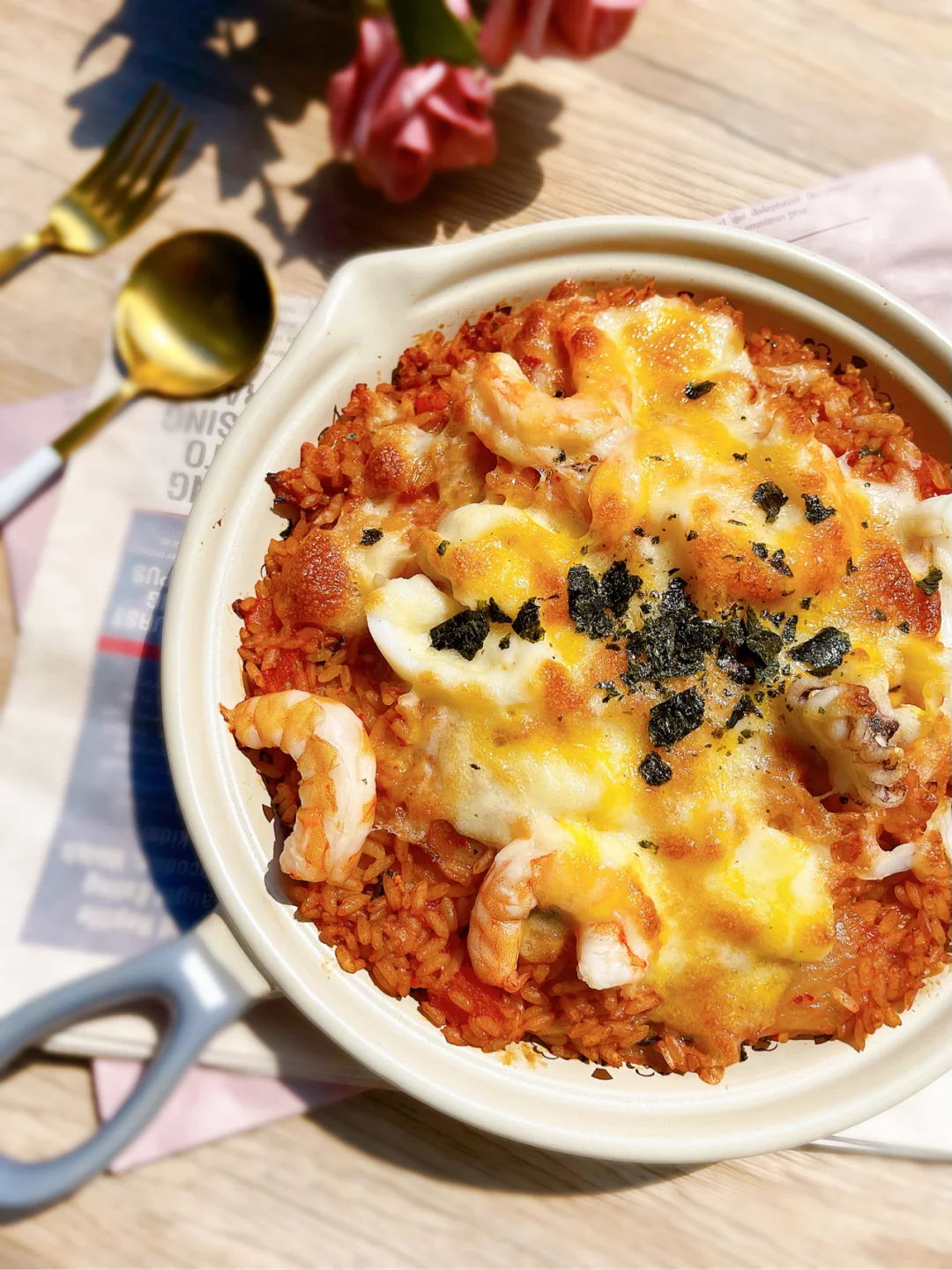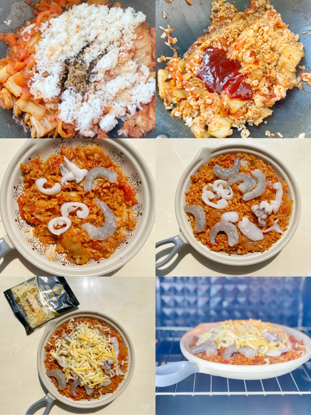 🌀前两天家里来客,焖了好多米饭,剩了大半锅。今天一个人在家,打开冰箱,用现有的食材做了一份20分钟🕗就能搞定的番茄泡菜海鲜芝士焗饭🫕当番茄泡菜遇上芝士,不仅不会针锋相对,反而碰撞出爱的火花。