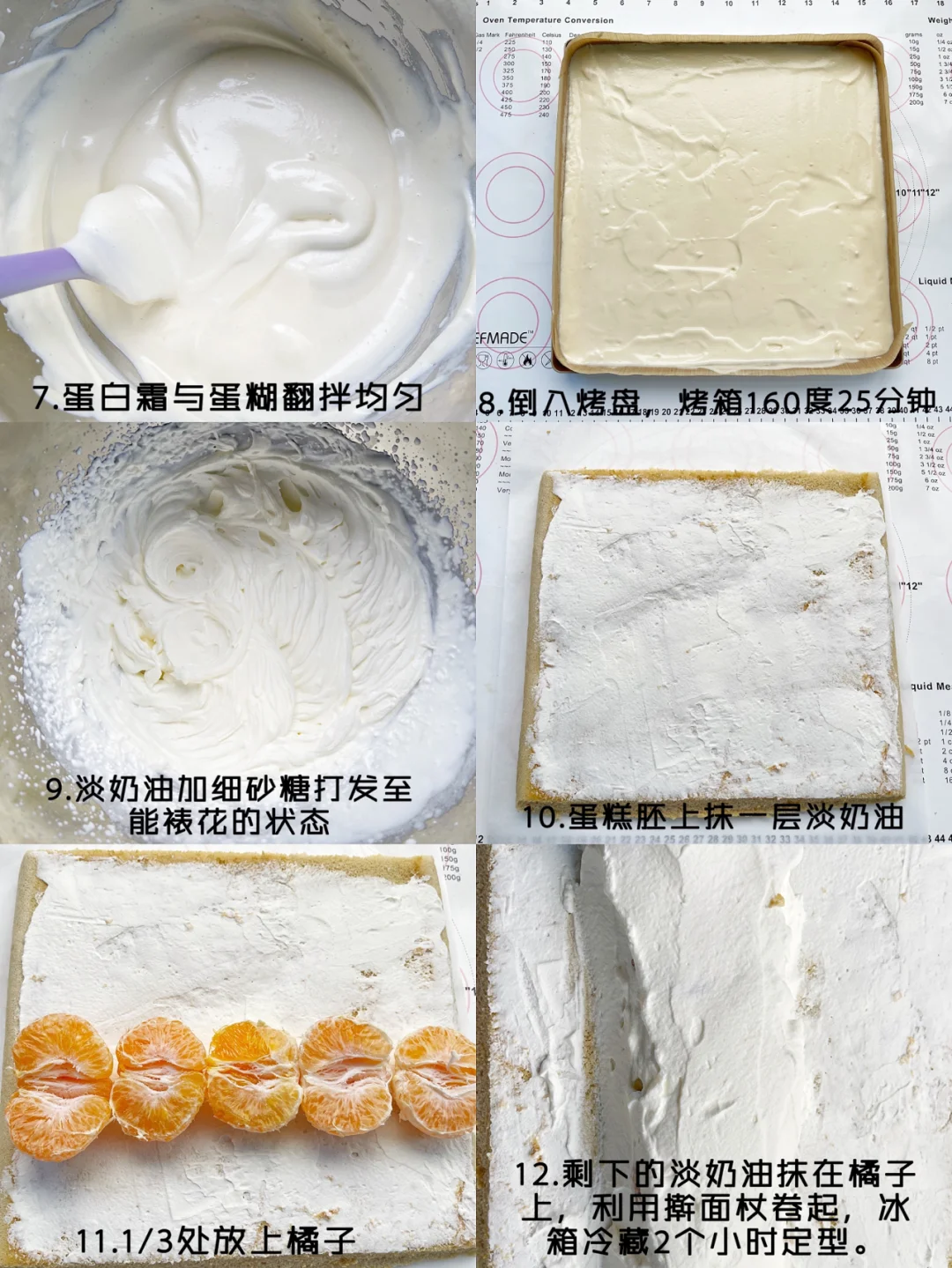 4️⃣冰箱冷藏好的淡奶油➕细砂糖打发至9分,有清晰纹路可以裱花的状态。先在蛋糕胚上抹一层。中间依次放上橙子/橘子。