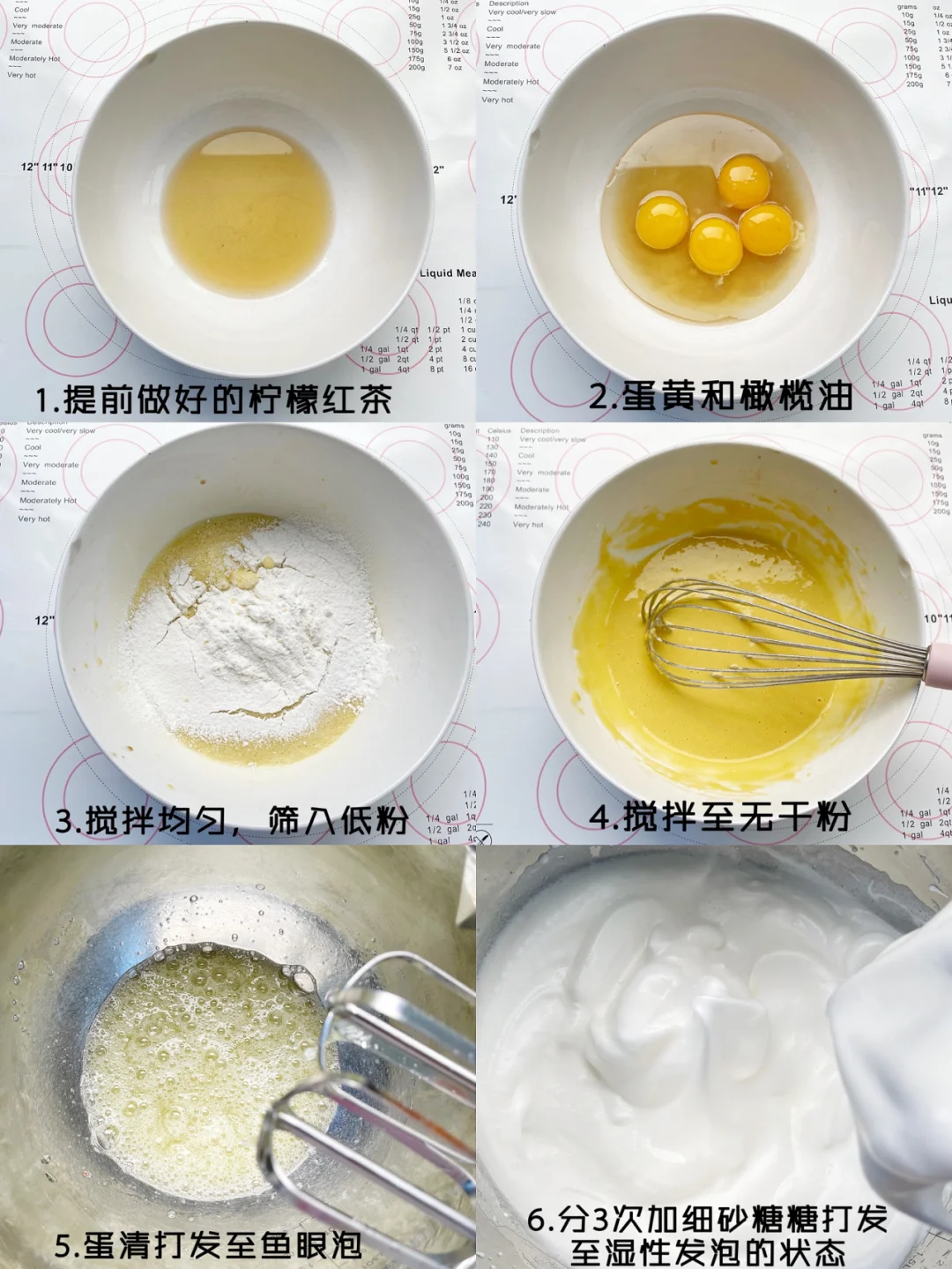 柠檬红茶液50g(红茶包一袋、柠檬半个、细砂糖30g)橄榄油40g 鸡蛋4个 低筋面粉50g 细砂糖50g