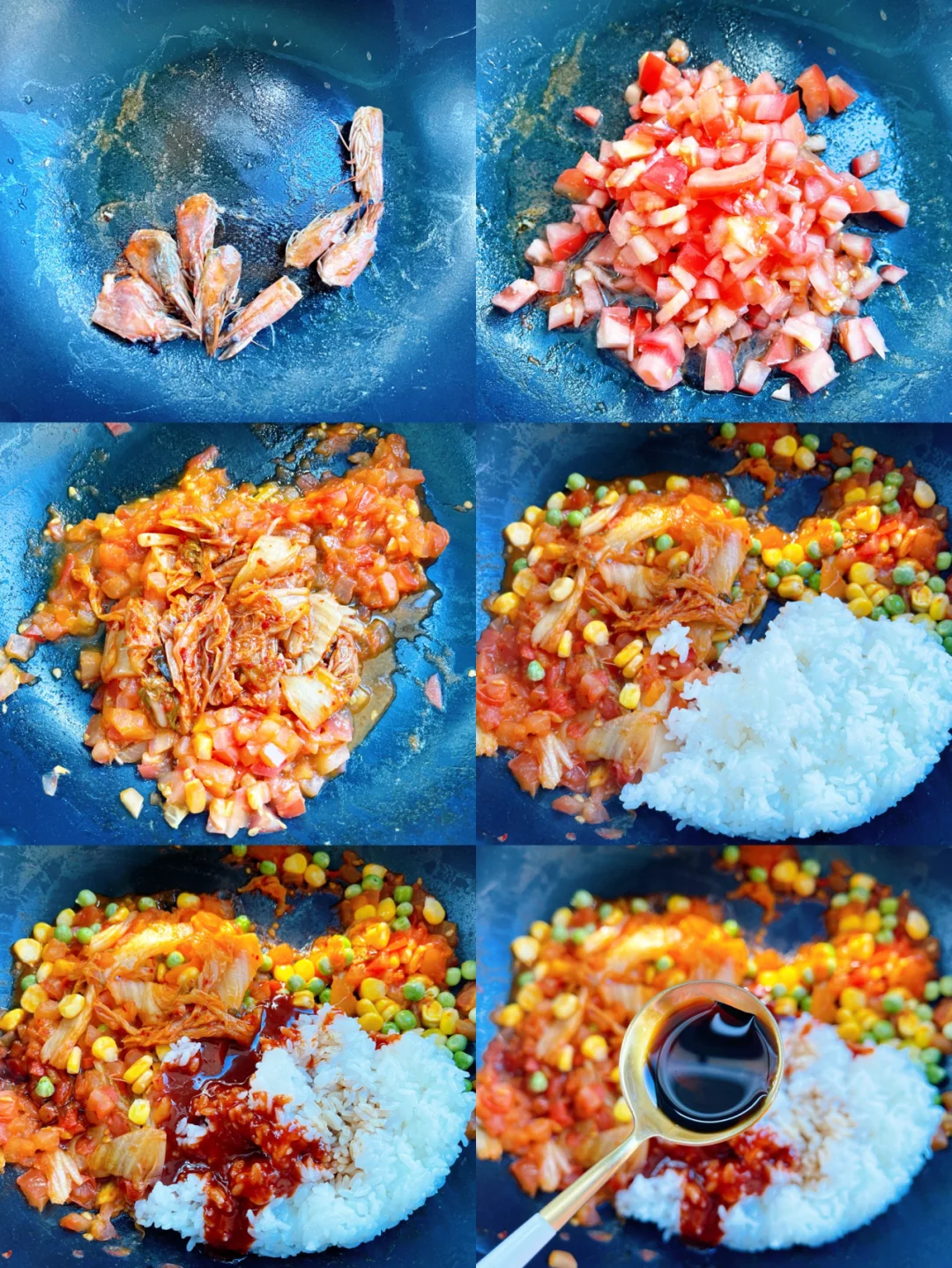3️⃣这个时候可以把蒸好的米饭放入锅里,依次放入韩式辣酱、生抽、玉米青豆和虾仁,翻炒均匀。