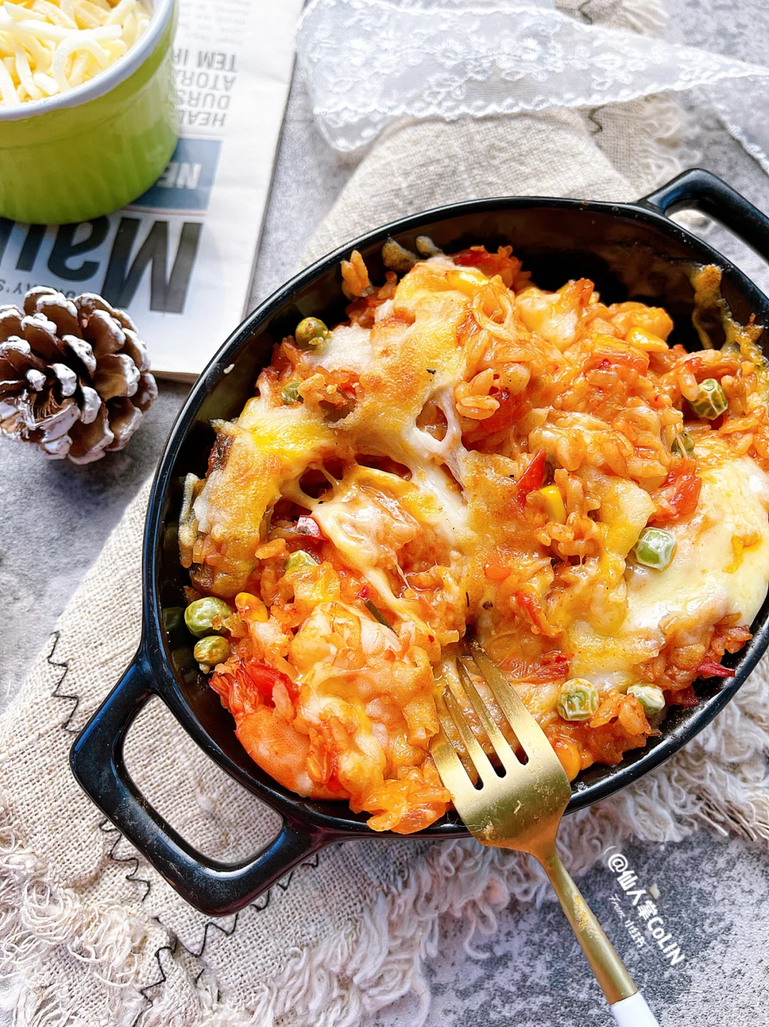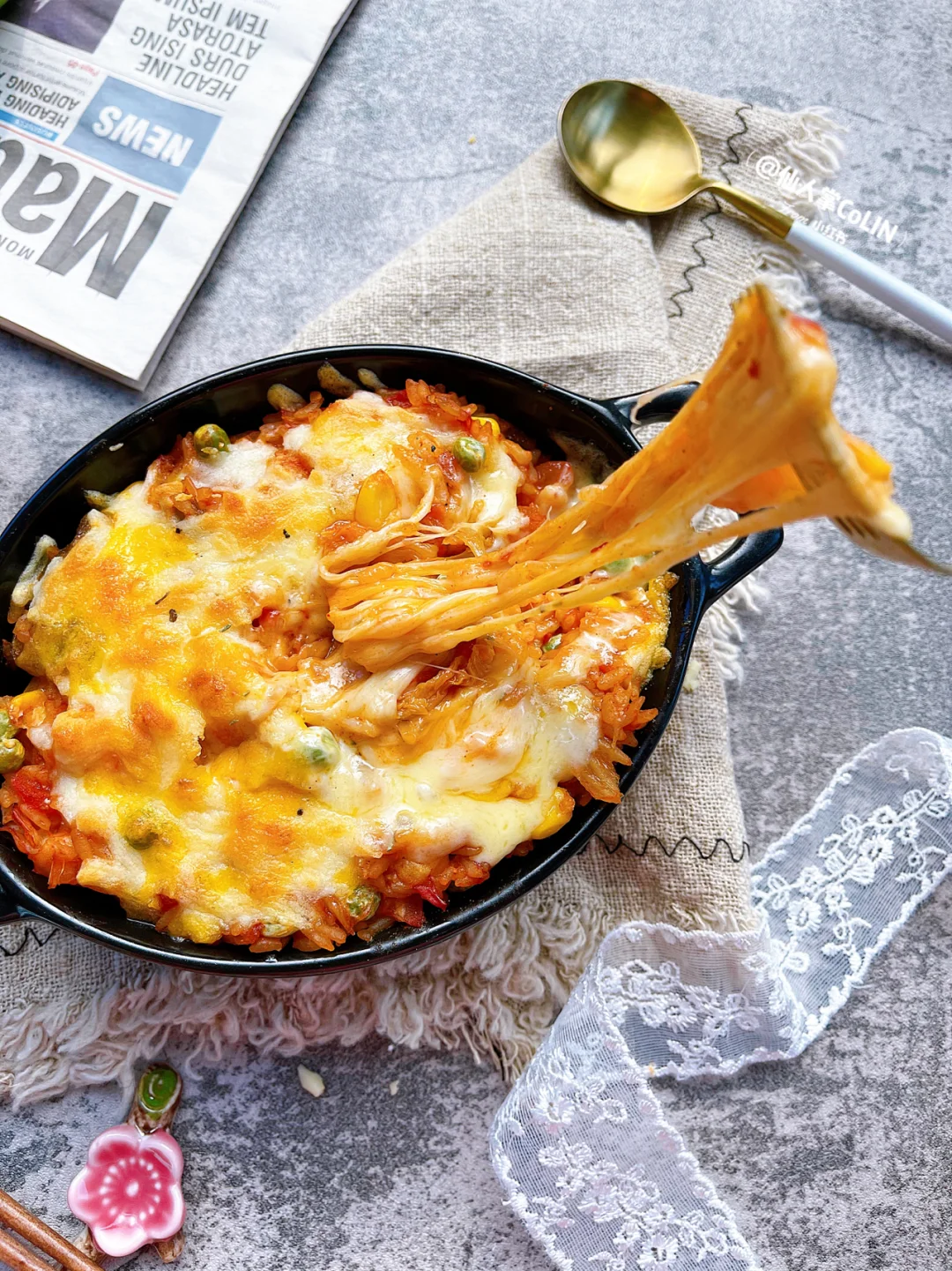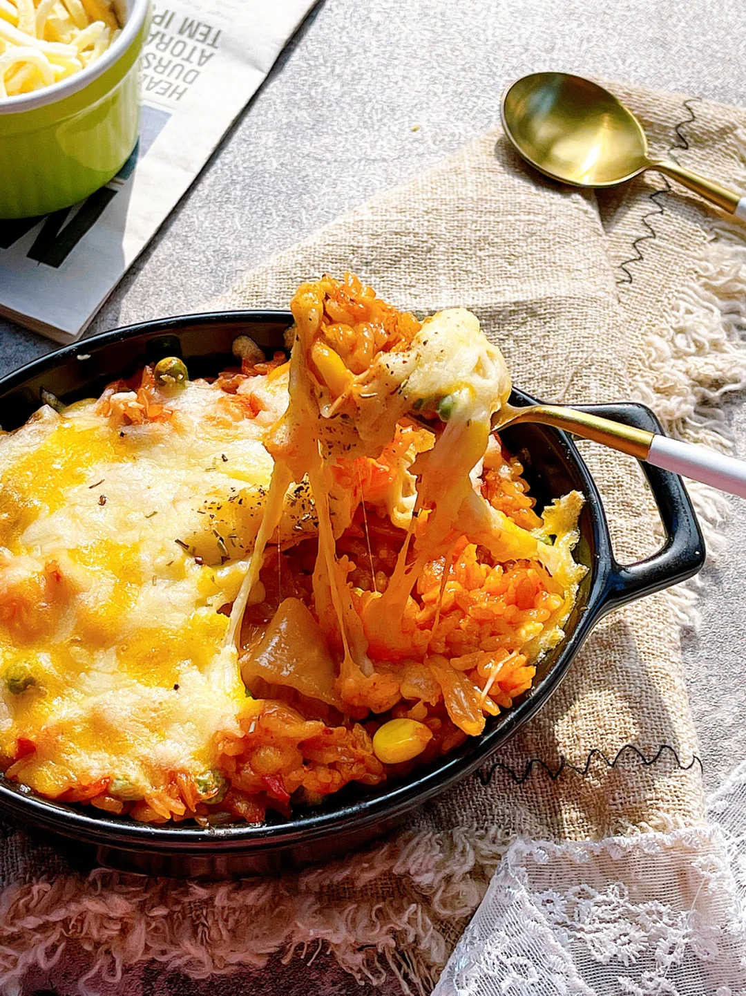 ▫️一层米饭,一层泡菜酱汁,一层奶酪送入烤箱烤至金黄,唉呀妈呀,烤制的过程中厨房里全是诱人的香味[暗中观察R]爱的就是上面那层厚厚的可以拉丝的奶酪🧀我这次用的还是烘焙奶酪,马苏里拉➕车达两种奶酪,口感层次忒丰富[害羞R]