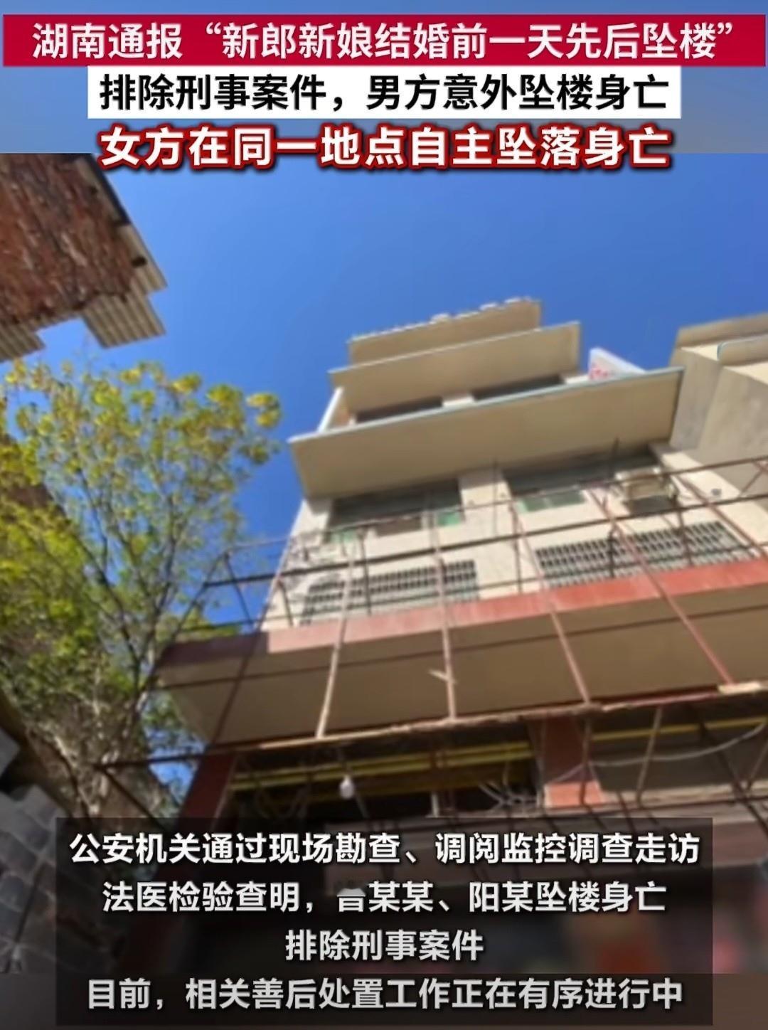 临近结婚,两位新人双双坠亡,最后4秒视频通话成迷。 近日,在湖南发生了一件令人心痛的事,25岁的新郎与相恋6年的女友在结婚前一天双双坠亡。原本11月25日是两位新人的新婚之日,两人却在24日凌晨发生了悲剧。 据男方家属透露,23日两位新人与亲朋好友进行了聚餐,商量婚礼事宜。饭后返回女方家中,24日凌晨,新郎从四楼跳楼坠亡,新娘随后跟随一起坠楼身亡。 据亲友表示,两人一起经营四家早餐店,经济收入稳定,男方有车有房,而且没有贷款和不良嗜好,在当地男方的条件较为优渥。而且两人恋爱时间比较久,感情也比较好,没有什么感情纠纷。发生这样的事属实很意外。 随后警方介入整个事件,警方发现在24日凌晨男方给女方发过两次视频通话,第二次通话仅4秒便被挂断,成为整件事的核心疑点。目前案件还没有具体的调查结果。