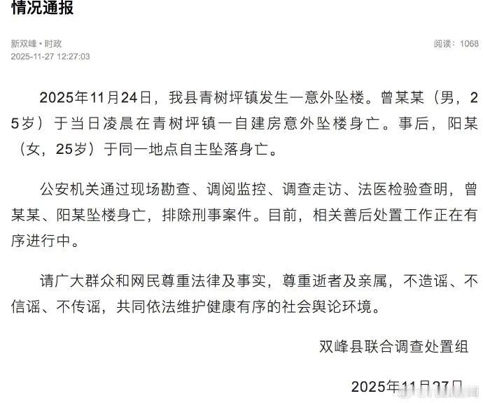 痛心!湖南25岁新人结婚前一天双双坠楼,这些法律问题必须搞懂!2025年11月24日,湖南双峰县一对即将结婚的新人遭遇悲剧:25岁的新郎曾某某凌晨在女方家自建房意外坠楼身亡,一小时后,25岁的新娘阳某在同一地点自主坠落离世。官方通报已排除刑事案件,初步线索显示新郎或因酒后误将窗户当厕所失足。这起令人扼腕的事件不仅让两个家庭破碎,还引发了关于彩礼返还、责任认定等法律问题的热议。 一、婚礼变葬礼:25岁新人的最后时光,疑点与悲痛交织 相信大家刷到这则新闻时,都和我一样心头一沉——还有一天就要办婚礼,本该是人生最幸福的时刻,却变成了两家人的葬礼,实在太令人痛心了。 根据官方通报和新郎堂姐的讲述,事情的经过大概是这样:新郎曾某某和新娘阳某都是25岁,感情一直很好,还已经住在一起了。11月23日,新郎特意把彩礼送到女方家,满心期待着第二天的婚礼。可没曾想,悲剧在凌晨发生了——新郎凌晨2点喝了酒,到6点多的时候可能酒还没醒,竟然找错了地方,把4楼的窗户当成了厕所,从1米多高的窗台失足掉了下去,当场身亡。 更让人揪心的是,在新郎坠楼一个多小时后,新娘阳某也在同一个地方自主坠落,没能抢救回来。目前公安机关已经做了全面调查,现场勘查、调阅监控、走访证人、法医检验都做了,最终排除了刑事案件的可能,也就是说不存在他人加害的情况。 现在网上有不少猜测,但新郎堂姐明确说两人感情很好,弟弟经济条件也不错,没什么矛盾。不过大家也有疑问:1米多高的窗户,怎么会轻易失足?新娘为什么会在一小时后选择轻生?这些疑问还得等警方的详细调查结果,但无论真相如何,两条年轻的生命没了,两个家庭的希望也彻底破灭了,想想都让人难受。 二、法律解读:彩礼该退吗?责任谁来担?这些规则要清楚 这起悲剧不仅让人悲痛,还牵扯出几个关键的法律问题,很多网友都在问:彩礼能要回来吗?女方坠楼,男方家需要担责吗? 首先说大家最关心的彩礼返还问题。新郎家已经送了彩礼,可婚礼没办成,两人也没正式登记结婚,这笔钱能要回来吗?答案是:可能返还,但不是全额返还。 根据《最高人民法院关于审理涉彩礼纠纷案件适用法律若干问题的规定》,双方没办理结婚登记手续,一方请求返还彩礼的,法院会支持,但不会一刀切。 具体到这个案子,要考虑几个因素:一是两人已经实际共同生活,这会影响返还比例;二是彩礼的用途,如果已经用来买嫁妆、办婚礼筹备等,这部分要扣除;三是双方的过错,这里没人有过错,都是意外;四是女方家也遭遇了丧女之痛,从情理和公平角度,也不会要求全额返还。所以大概率是双方协商,或者法院根据实际情况酌定返还一部分,不会让某一方承担全部损失。 其次是责任认定问题。有人问,新郎是在女方家坠楼的,女方家要不要担责?新娘的轻生,男方家有没有责任? 先看新郎坠楼:如果女方家的窗户存在安全隐患,比如没有防护栏、窗台设计不合理等,那女方家作为房屋所有人,可能要承担一定的安全保障义务,承担部分民事责任;但如果窗户是符合安全标准的,新郎是因为自己醉酒误判导致失足,那主要责任就在他自己身上,女方家没有过错的话不用担责。 再看新娘轻生:警方已经排除刑事案件,说明新娘是自主选择。如果男方家没有任何过错,比如没有争吵、没有逼迫等行为,那男方家不用承担刑事责任。但从民事角度,会不会有补偿?之前上海有个案例,情侣吵架后女方跳楼,法院认为男方没妥善安抚,判了30%的赔偿责任,但这个案子里两人没矛盾,新娘是因为悲痛过度轻生,这种情况男方家一般不用承担民事赔偿责任,除非有证据证明男方家有过错 。 还有个大家可能忽略的点:婚姻关系是否成立?答案是:不成立。因为两人还没办理结婚登记,只是办了订婚仪式,法律上不算夫妻。所以男方的遗产,新娘没有法定继承权;同样,女方的遗产,男方也没有继承权。 三、网友观点:惋惜之余,更多是对生命的敬畏 这起事件在网上引发了热议,网友们的观点很一致,满是惋惜和对生命的敬畏,核心集中在三个方面: 一是对悲剧的痛心和对逝者的哀悼。有网友说:“太可惜了,25岁正是最好的年纪,马上就要结婚了,怎么就出了这种事?两个家庭以后可怎么过啊,心疼双方父母。” 二是对彩礼和责任的理性讨论。有网友说:“彩礼这事,男方家肯定想退,但女方家也丧了女儿,还是协商解决吧,别再为了钱争执了,让逝者安息。” 三是对生命的珍惜和反思。有网友感慨:“酒真的误事啊,要是不喝酒,可能就不会出这种错了,以后不管什么场合,喝酒都得有分寸。” 你觉得这起事件中,彩礼应该返还吗?如果房屋有安全隐患,责任该怎么划分?对于保护自己和家人的安全,你还有哪些好的建议?欢迎在评论区留言,让我们一起为逝者祈福,也让更多人重视安全、珍惜生命。愿这样的悲剧再也不会发生。