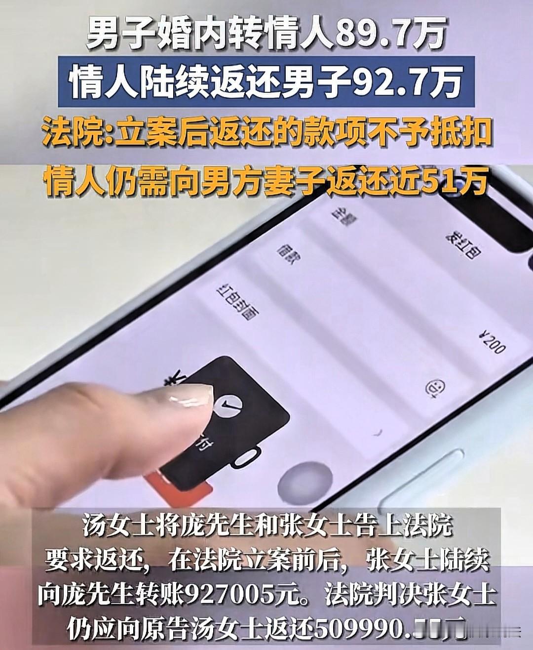 四川达州,男子背着妻子陆续转了896995.55元给情人,然后和妻子离婚,以为瞒天过海,没想到,妻子发现后,直接将男子和其情人起诉到法院,要求返还89.7万,期间,男子和情人打配合,情人在法院立案前后,接连给男子转账92.7万,想以此抵扣,法院仍判:情人向原配返还近51万元,这是怎么回事呢? 汤女士怎么也没想到,离婚后,却发现丈夫庞先生居然在婚姻存续期间,背着自己和一个女人好上了,还偷偷给那女人转了89.7万! 那自己跟丈夫结婚这17年到底算什么?汤女士无法忍受被背叛的滋味,更无法接受被丈夫欺骗,她决定为自己讨回公道。 于是,汤女士一纸诉状将庞先生和张女士告上法院,要求返还896995.55元。 原来,汤女士和庞先生曾是一起携手走过17年的夫妻,2007年12月21号是他们登记结婚的日子,那时候以为会相伴一生。 然而,造化弄人,二人的婚姻随着时间的推移偏离了轨道。 庞先生耐不住寂寞,在婚姻存续期间,和张女士暗生情愫,逾越雷池,偷偷保持着见不得人的关系。 而这一切,作为原配的汤女士毫不知情,也从未怀疑过丈夫庞先生。 庞先生和张女士在一起后,总觉得亏欠她,为了表达自己的爱意,他通过各种方式,频繁的给张女士转钱,发红包,或者代付。 那些转账记录中,充斥着大量的特殊金额,什么“520、13.14、520.13、666.66、888.88”等等。 部分转账备注更是肉麻的很,七夕的时候,庞先生会给张女士转账备注“七夕快乐,话不多!但心一直在你这!” 平时偶尔还会转账备注为:“在努力的日子里记得我的好,忠诚于我的爱,永远爱你,永远你都是个宝。” 这种转账加甜言蜜语的糖衣炮弹把张女士哄的团团转。 另外,张女士过生日的时候,庞先生更是出手大方,给她转了66666.66元,备注生日快乐。 这些转账都带着庞先生对张女士的爱意,也证明了他对这段婚外情的全心全意的投入,据统计他陆续给张女士转了896995.55元。 同时,对原配汤女士来说简直就是一种极大的讽刺,她对家庭的付出终究不及一个别的女人,而庞先生对张女士说的“忠诚我的爱”只让人觉得心寒。 2024年8月12号,庞先生和汤女士办了离婚手续。 汤女士本以为这段婚姻已经结束,可她在离婚后整理财产时,却意外发现了庞先生和张女士有不正当关系。 愤怒和委屈涌上心头,汤女士便告到法院,要求返还这笔夫妻共同财产。 在法院立案前后,张女士似乎察觉到了事情的严重性,她开始陆续给庞先生转账。 从2019年11月26日,2023年11月30日,她分两次向庞先生转账共计387005元。 而在诉讼期间,张女士更是加快了转账的进度,2025年4月8号(开庭前一天)、4月9日(开庭当天)、4月13日,她又分多次给庞先生转了共计540000元。 张女士觉得,她把这些钱返还给庞先生,就能抵消这场纠纷,可是,她没想到,事情没她想象的那么简单。 庭审中,双方对庞先生向张女士转账896995.55元,以及张女士向庞先生转款927005元这一事实都没有异议。 那么,问题来了,庞先生转给张女士89.7万,张女士转回来92.7万,而且女的还多转了点,不是已经扯平了吗? 《民法典》第1062条规定:夫妻在婚姻关系存续期间所得的下列财产,为夫妻的共同财产,归夫妻共同所有,夫妻对共同财产,有平等的处理权。 第一,庞先生和汤女士是夫妻,婚姻期间财产归两人共有。庞先生没经汤女士同意,就把近 89.7 万夫妻共同财产赠给张女士,这既侵犯汤女士财产权益,又违背公序良俗,按法律规定,赠与行为无效,张女士得返还所得财产。 第二,立案前,张女士分两次给庞先生转了 38.7 万多元。这算是她主动处理自己占有的钱,还减少了庞先生无效赠与的财产数额,没损害汤女士直接权益,所以,法院认为这笔钱,能从张女士需返还给汤女士的总金额里扣除。 第三,汤女士已起诉张女士返还财产,诉讼中张女士没经汤女士同意,擅自把钱转给庞先生,没把汤女士合法财产权益当回事,不能对抗汤女士返还请求。 另外,庞先生和汤女士已离婚,还有抚养费和财产纠纷,庞先生银行账户因其他案子被冻结。 张女士转给他的 54 万,庞先生没履行法定义务,也没和汤女士商量处理共有财产,而是转给其他公司。 如果这笔钱允许抵扣,汤女士可能拿不到应得的钱,还浪费公共资源。 所以,法院判决:这 54 万不能抵扣,张女士扣除立案前返还387005元后,还得再返还汤女士 509990.55元。 通俗的说,后给的54万是在立案后,情人返还男方的,而且男方拿了大部分都用掉了,原配实际无望拿到的。所以,那54万不被认定抵扣,需要情人另外支付。 有人说,庞先生和张女士两个人唱双簧,就不想给前妻钱,你怎么看呢? 关注@福康说法 从日常点滴学法律