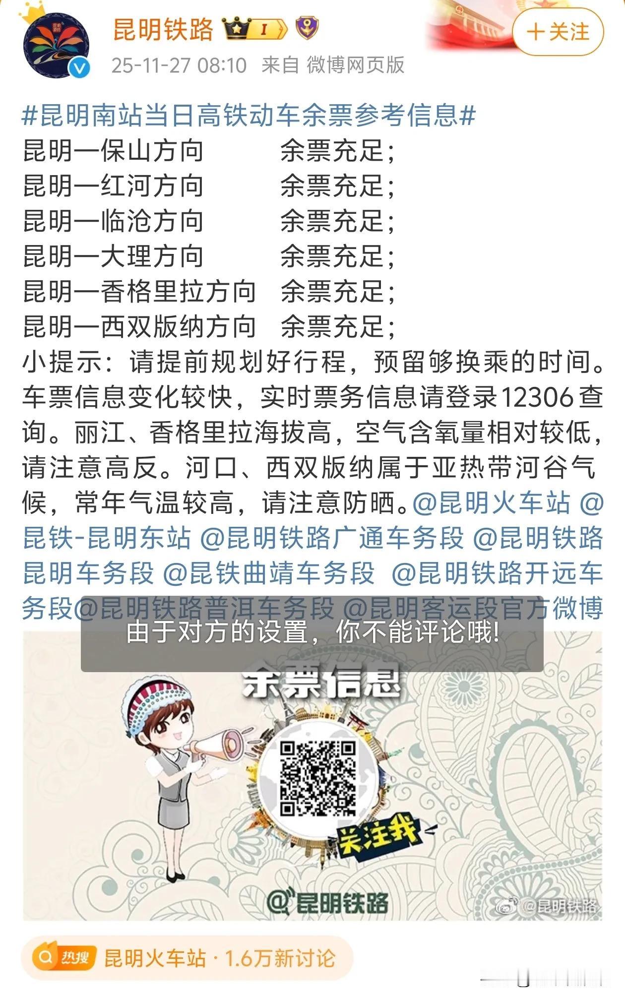 昆明铁路的小编这操作让领导头大。事故发生近8个小时了,竟然还在发工程维修的信息。管理账号的小编和审编都没睡醒?目前看到整个微博账号都隐藏起来了,还额外增加了禁止所有微博全部取消新增评论功能(事先没有关注过其微博,没有评论过其微博,所以不存在被小黑屋,观察其它网友的微博也是这样)。