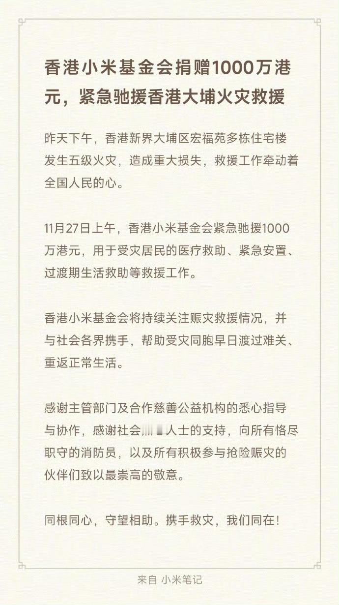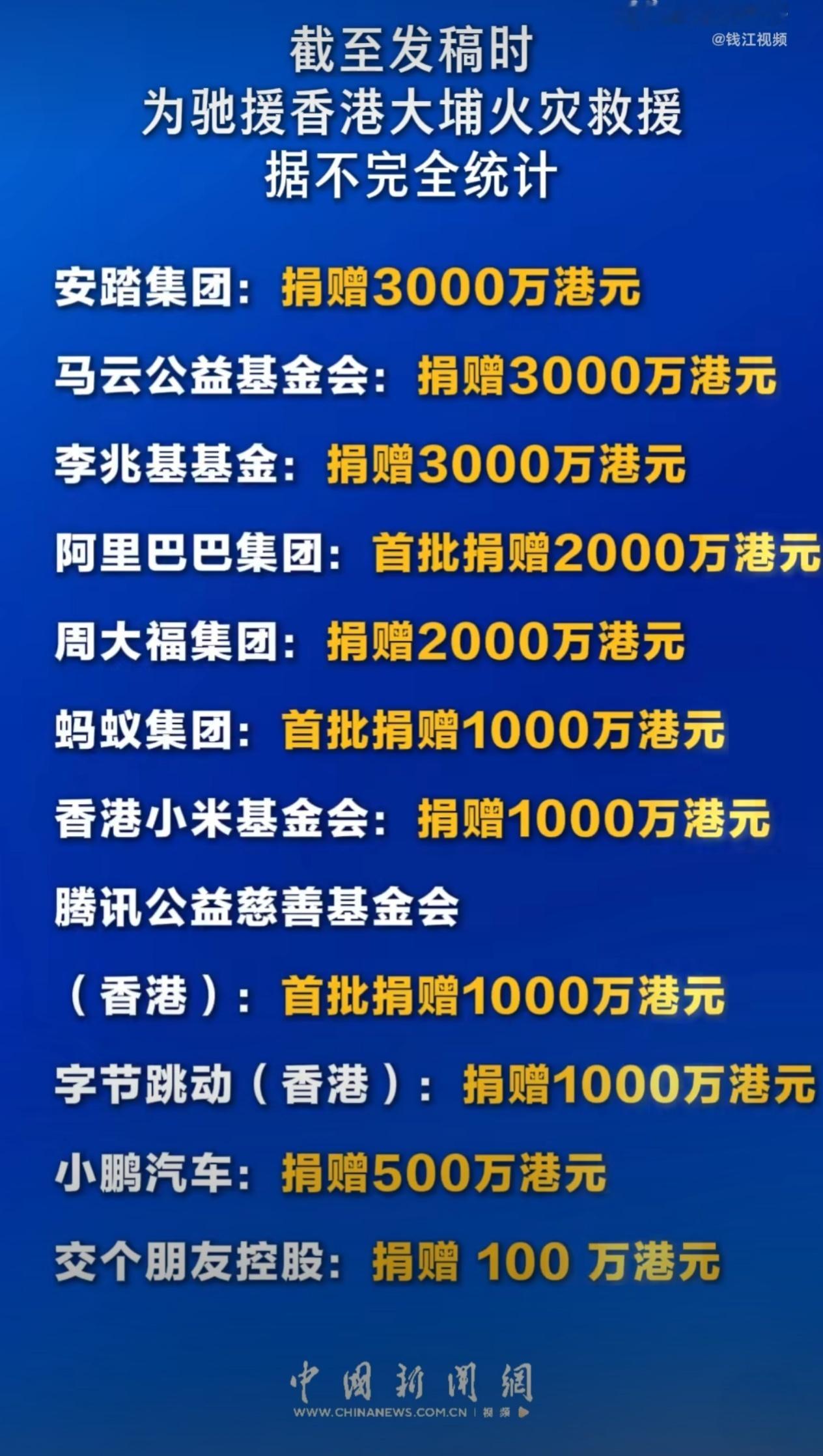多家车企为香港火灾捐款据目前不完全统计,小米,比亚迪,腾讯,网易,字节跳动等捐款1000万港元,阿里捐款2000万港元,小鹏汽车捐款2000万港元,马云基金会捐款 3000 万港元,安踏捐赠3000万(含2000万防寒物资)等等,并且还有各种物资以及设备的支援,有钱的出钱有力的出力,这方面我们真很团结
