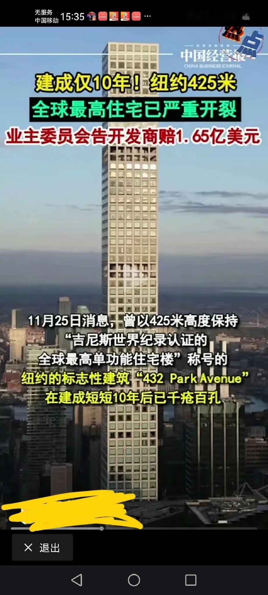 全球最高住宅楼,位于美国纽约的第一高住宅楼,在纽约的中央公园边上,已算是同等高度,单层面积最小的住宅楼,也是住宅楼同等高度公摊面积最大的了吧!关健是没有这么高的住宅楼了。 现在这幢超高层住宅楼已经开始开裂了(老化了),我就想买这楼的住户们也是不差钱的主人,现在要找开发商赔偿了,但是对于开发商来说1点65美元来设应该问题不大,没有实力的开发商不可能把在纽约的中央公园旁边造出这么高的住宅楼吧!以上仅供参考,属个人意见!
