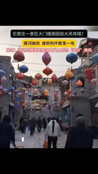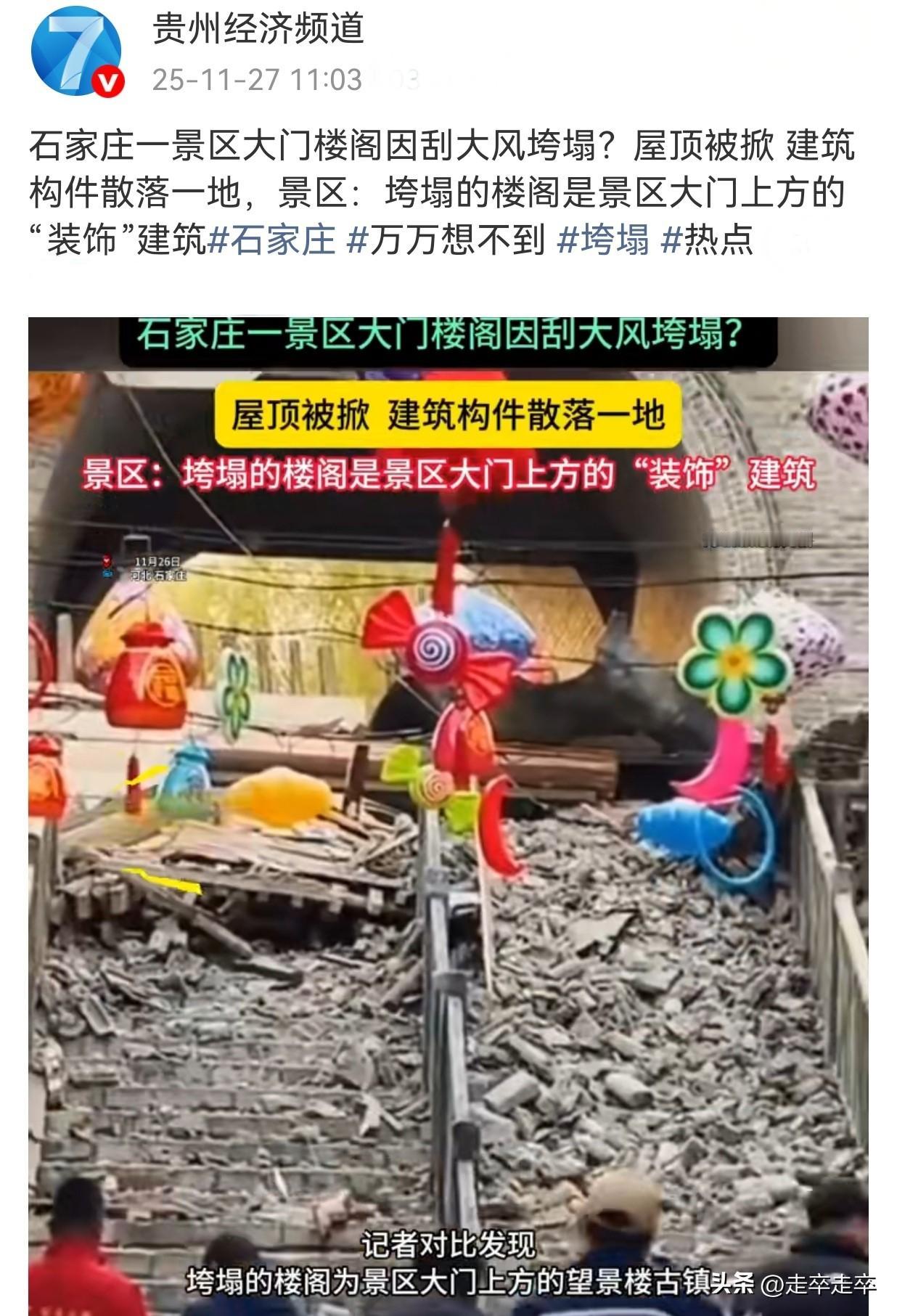文旅开发中安全问题才应该是第一首位。 25年11月26日16时许,河北石家庄鹿泉区龙泉古镇景区主入口上方的[望景楼]楼阁突发垮塌。这座斥资27亿打造的仿古景区大门楼阁在强风中轰然垮塌。屋顶被强风整体掀起,木质构件和砖瓦如雨点般砸向地面,瞬间覆盖大门阶梯区域。事发时附近有游客正在观看演出,人群紧急从侧门撤离,未造成人员伤亡。 龙泉古镇景区最初称垮塌部分为装饰性建筑,但后续官方通报证实,垮塌的望景楼实为仿古设计的核心景观建筑。(非文物)27日全天停业检修,28日就恢复开放。在突发的极端天气情况下为何望景楼会垮塌,是不可抗力还是工程质量不过关?这些问题有待官方的后续调查。 争议的问题是,景区工作人员的回应太轻描淡写了。工作人员称“仅是构件掉落”,指责网传视频[夸张],并强调不影响游览,这是为什么呢?游客的安全不是在首位吗!而且有朋友指出当日当地最大风力仅7-8级(北方秋冬季常见天气),耗资巨大的地标建筑如此脆弱实属异常。网络记录显示,该景区23年曾发生[龙形雕塑被大风吹落]事件,此景区或许会有重复性安全隐患。 近年兴起的人造古镇,为追求复古视觉效果,常简化建筑抗风压、抗震结构设计。景区虽设有天气预警机制,但强风来临时并未提前关闭露天区域或加固高危建筑阻止游客去游览。日常在文旅项目验收多侧重于外观还原度,对抗风性能等安全指标也缺乏强制检测标准。截至27日官方通报,排查工作仍处于“下一步”计划阶段,暂未公布具体排查范围、时间表或进展。景区的安全问题
