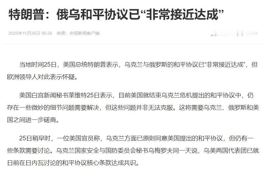 美国总统特朗普正式宣布了 11月26日,美国总统特朗普宣布,乌克兰与俄罗斯的和平协议已经“非常接近达成”。白宫方面也表示,虽然还有一些细节问题需要解决,但并非无法克服。 别以为特朗普是随口吹牛,白宫紧跟着就补了句:协议是还有点细节要磨,但都不算啥大麻烦。可扒拉遍各方消息就明白,这所谓的“快成了”,根本不是俄乌谈拢了,是美国和乌克兰先把协议改了个底朝天,原本28条的方案,在日内瓦聊了一轮就砍成19条,那些能让俄乌两边吵到掀桌子的硬骨头,全给偷偷抹掉了。 这里面的门道,全藏在条款的加减里。原先那28条里,领土怎么分、乌克兰能不能进欧盟北约、冲突里的“战争罪”要不要特赦,全是俄乌吵到脸红脖子粗的核心疙瘩。 就说领土这事儿,俄方早把顿涅茨克这些地方当成自己的“新地盘”,乌方却死攥着说要拿回来,这一条不解决,根本没法往下聊。结果到了19条的新版本里,这些关键事儿全被“先放一放”,扔给美乌总统最后拍板,剩下的全是些两边都不太较真的表面活儿。 比如之前说要把乌军人数卡到60万以内,现在松口了;那些一提就容易起争议的追责条款,干脆直接删没了,怎么看都像美国和乌克兰先搭出来的“和平空架子”。 这事儿最耐人寻味的,还是各方的反应。乌克兰国家安全与国防委员会的乌梅罗夫倒是先松了口,说和美国在核心条款上聊妥了,泽连斯基还打算27号直接找特朗普当面说。这也不难想,乌克兰的底气全靠美国输血撑着,现在美国把难啃的骨头都剔干净了,就算乌克兰心里不情愿,也没多少讨价还价的余地。 可俄罗斯那边压根没接这茬。克里姆林宫发言人佩斯科夫直接说,俄方连这19条的新方案影子都没见着,现在各种消息乱得像一锅粥,他们还在等美国给个准信。不过他话里留了活口,说美方之前的版本里,有符合俄美共识的实在内容,能当谈判的底子,意思很明白,删完争议条款的新版本要是偏着乌克兰,俄方可不认账。 特朗普急着把“促成和平”的功劳往自己身上揽,算盘打得噼啪响。毕竟要竞选,能拿出“调停俄乌冲突”的成果,比啥都管用。再说美国援助乌克兰,早就没了当初的热情,国内反对的声音越来越大,赶紧把战事按住,还能省一大笔开支。 可他忘了,和平协议不是美国和乌克兰两家说了算的,俄罗斯的态度才是关键。普京一直强调,停火必须以乌克兰承认“新的领土现实”为前提,现在最核心的领土问题被搁置了,俄方怎么可能轻易点头? 欧洲那边更是一肚子不踏实,本来特朗普对俄的态度就让欧洲提心吊胆,现在这“缩水版”协议看着就像美国单方面的交易,压根没考虑欧洲的安全利益。连《华盛顿邮报》都泼了冷水,说就现在各方的立场差距,真要谈拢,说不定得花上一年半载。 说白了,这19条协议更像美国给俄乌画的一张“和平饼”。把最疼的矛盾先藏起来,造出“快成了”的假象。但战火能不能真停下,终究要看俄美两家的底线能不能对上,俄方要的是领土保障,美方图的是竞选政绩,乌克兰夹在中间身不由己,这些绕不开的问题,才是和平真正的门槛。现在特朗普喊得热闹,可只要俄罗斯没松口,这“非常接近”的和平,就还隔着十万八千里。