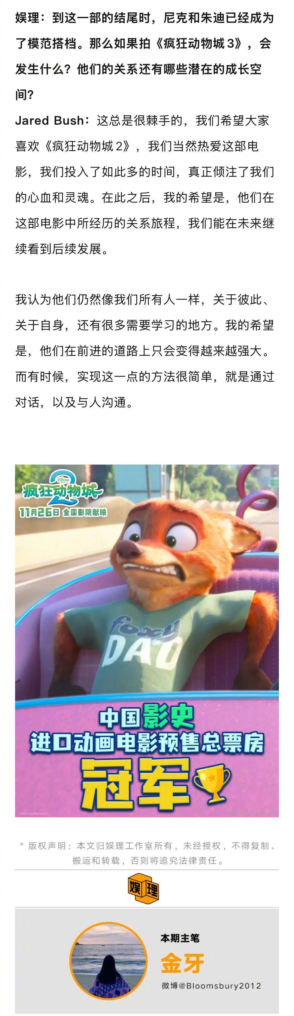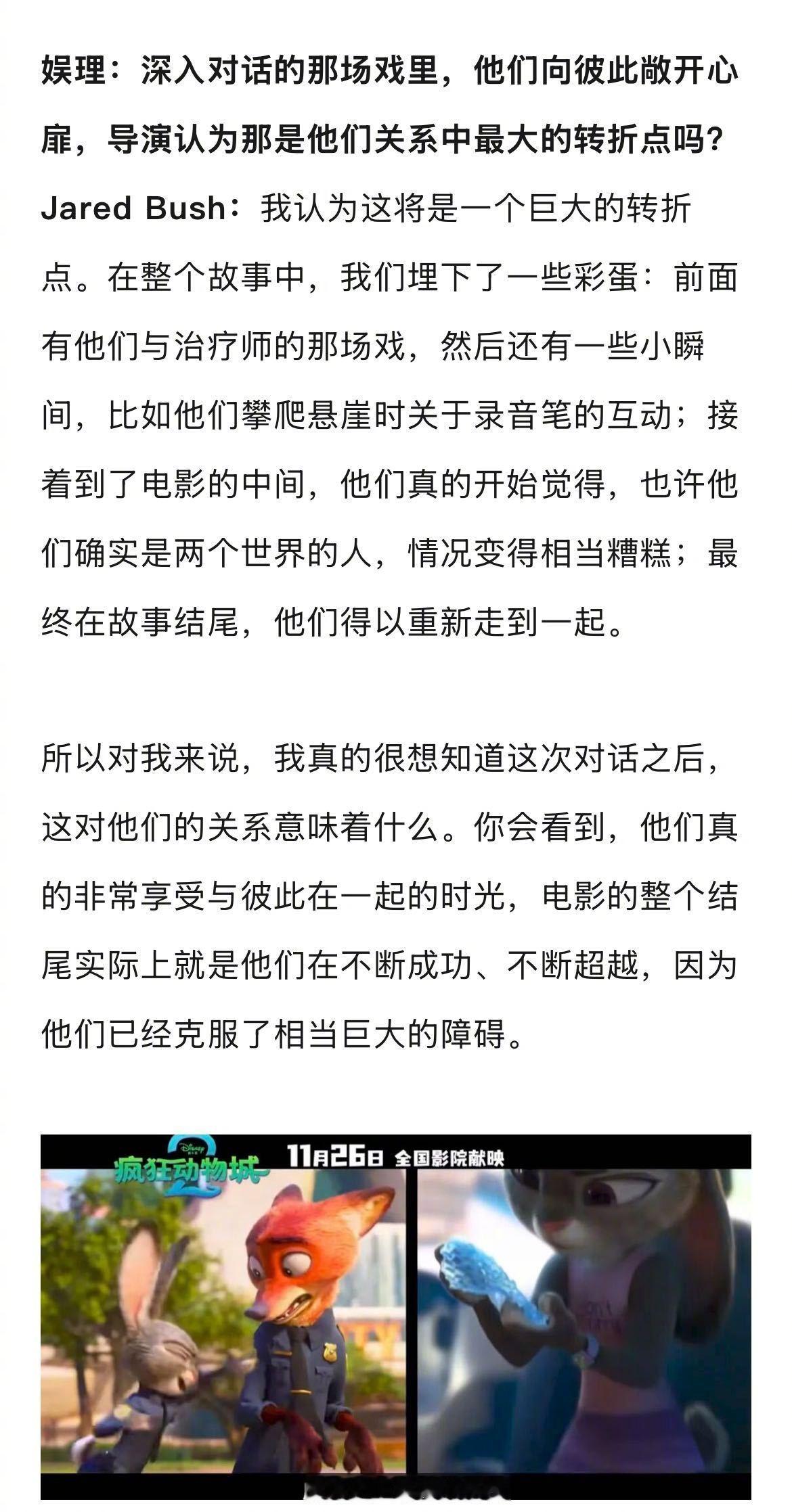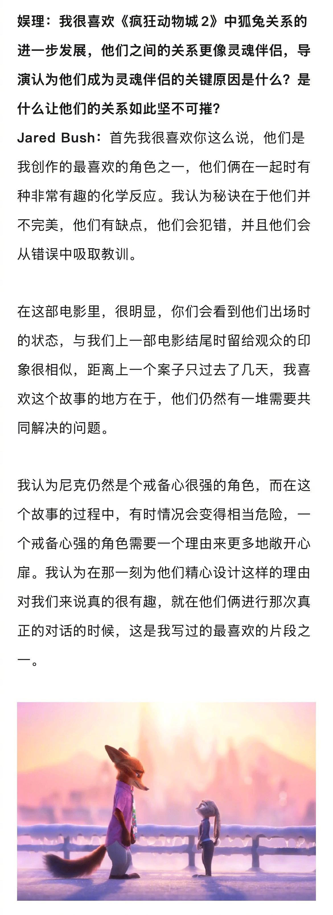 导演谈朱迪尼克是灵魂伴侣的原因《疯狂动物城2》导演确认尼克朱迪是他创作的最喜欢的角色之一,“他们俩在一起时有种非常有趣的化学反应。我认为秘诀在于他们并不完美,他们有缺点,他们会犯错,并且他们会从错误中吸取教训。我认为尼克仍然是个戒备心很强的角色,一个戒备心强的角色需要一个理由来更多地敞开心扉…”导演谈《疯狂动物城3》尼克朱迪成长空间:我的希望是,他们在这部电影中所经历的关系旅程,我们能在未来继续看到后续发展。我认为他们仍然像我们所有人一样,关于彼此、关于自身,还有很多需要学习的地方。他们在前进的道路上只会变得越来越强大。导演回应疯狂动物城3和朱迪尼克一起重返动物城