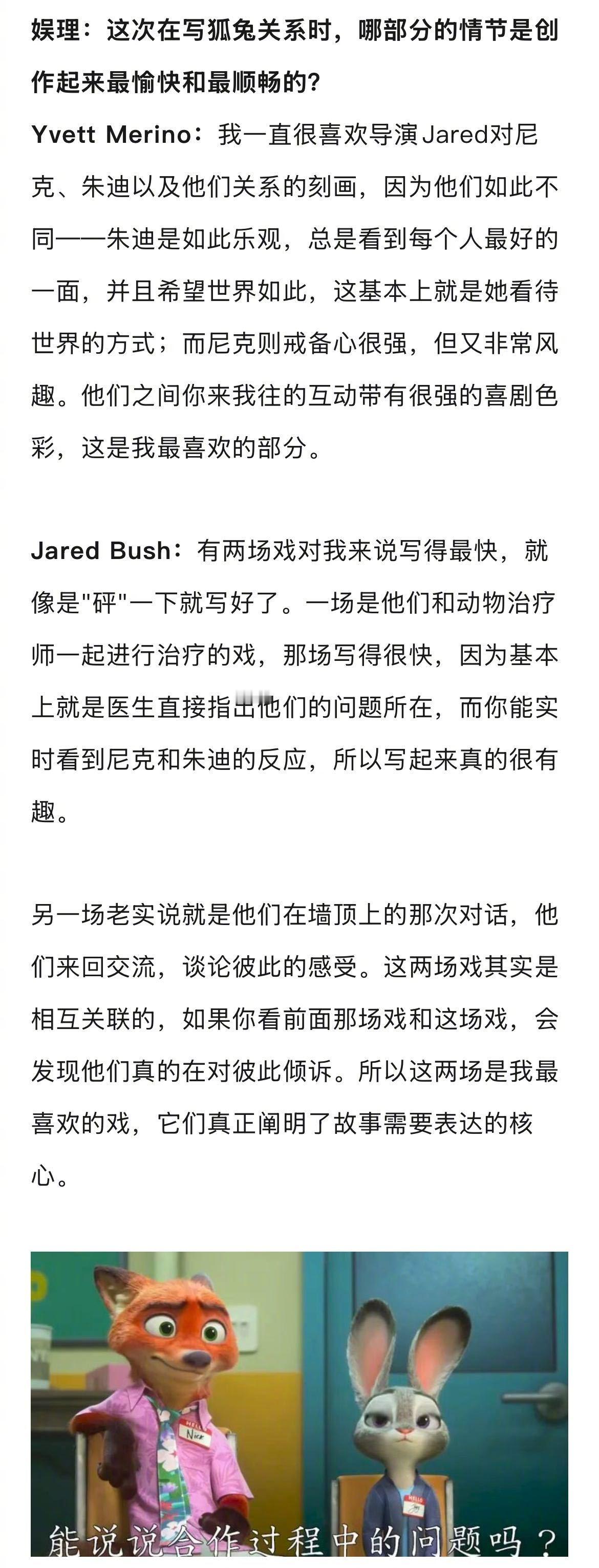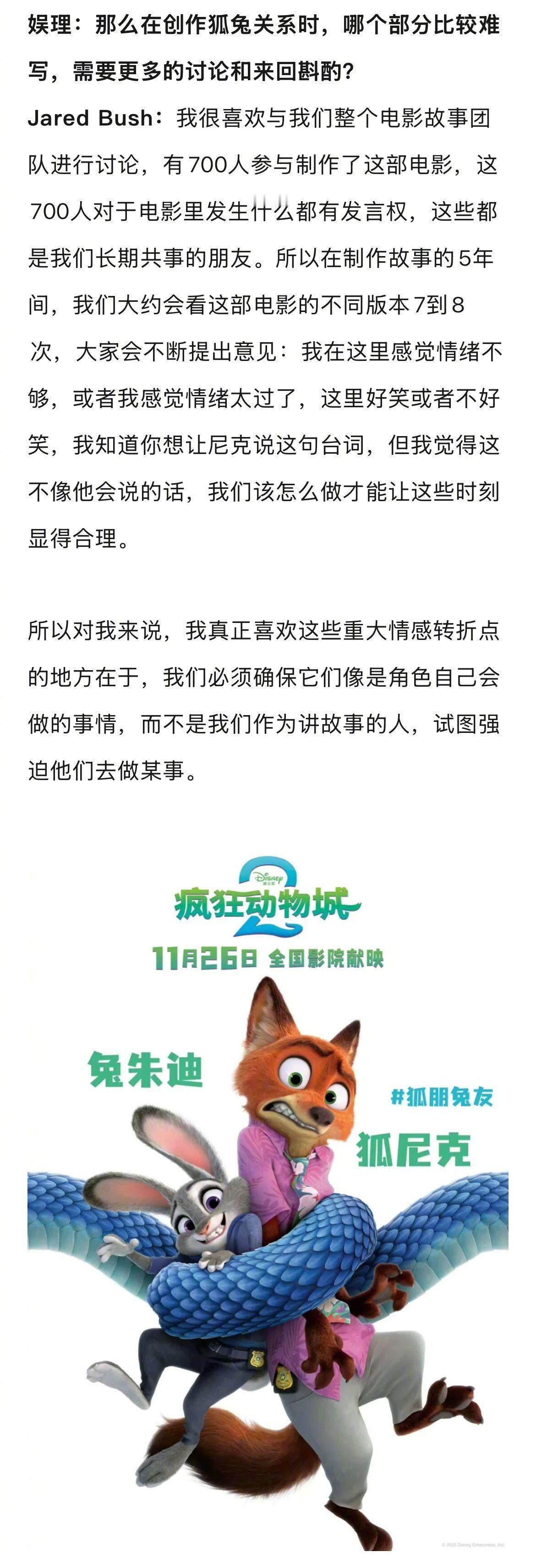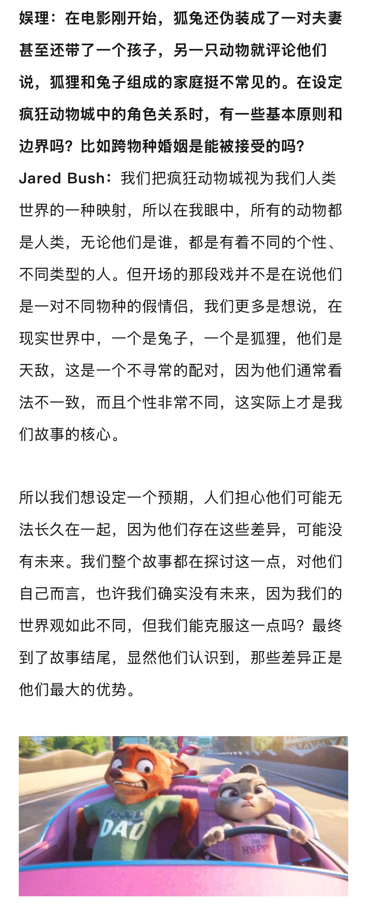 导演谈朱迪尼克是灵魂伴侣的原因《疯狂动物城2》导演确认尼克朱迪是他创作的最喜欢的角色之一,“他们俩在一起时有种非常有趣的化学反应。我认为秘诀在于他们并不完美,他们有缺点,他们会犯错,并且他们会从错误中吸取教训。我认为尼克仍然是个戒备心很强的角色,一个戒备心强的角色需要一个理由来更多地敞开心扉…”导演谈《疯狂动物城3》尼克朱迪成长空间:我的希望是,他们在这部电影中所经历的关系旅程,我们能在未来继续看到后续发展。我认为他们仍然像我们所有人一样,关于彼此、关于自身,还有很多需要学习的地方。他们在前进的道路上只会变得越来越强大。导演回应疯狂动物城3和朱迪尼克一起重返动物城
