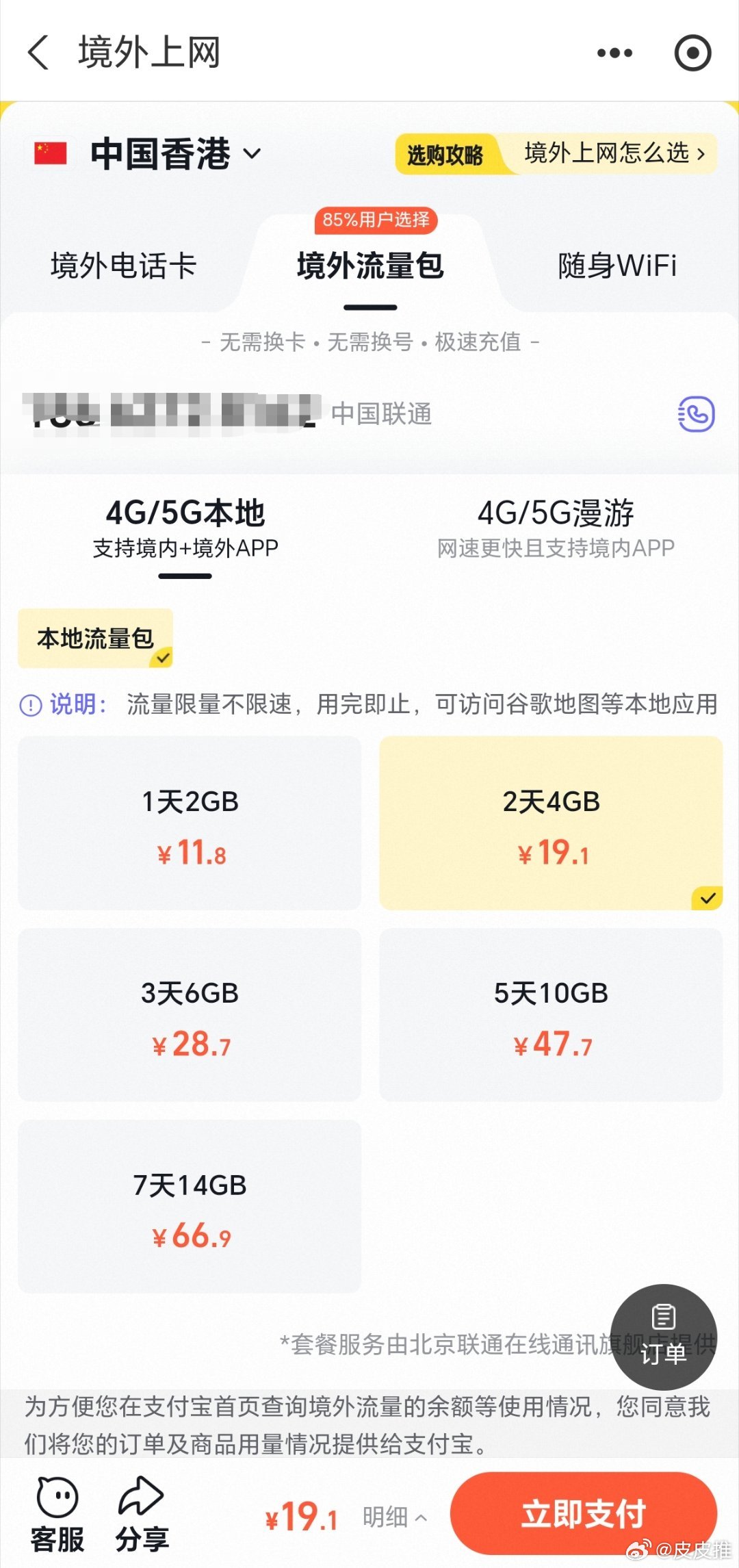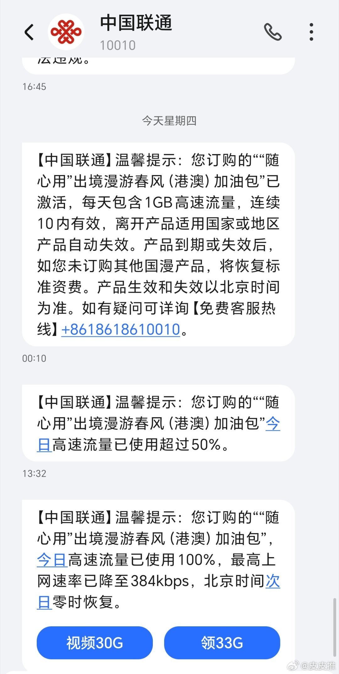 在联通官方APP买的流量包,今天上传了几个视频和一些图片,发现突然被限速了,都快上不了网了,赶紧去支付宝买了4个G的流量,解决了流量焦虑。科技先锋官 香港·香港海港城
