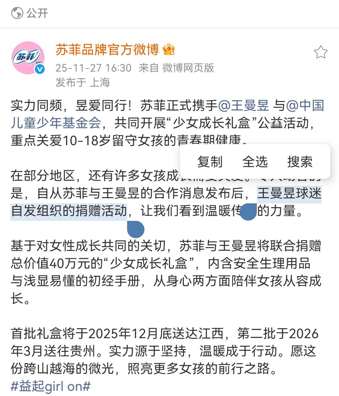 苏菲实力品牌代言人王曼昱“自从苏菲与王曼昱的合作消息发布后,王曼昱球迷自发组织的捐赠活动,让我们看到温暖传递的力量。”