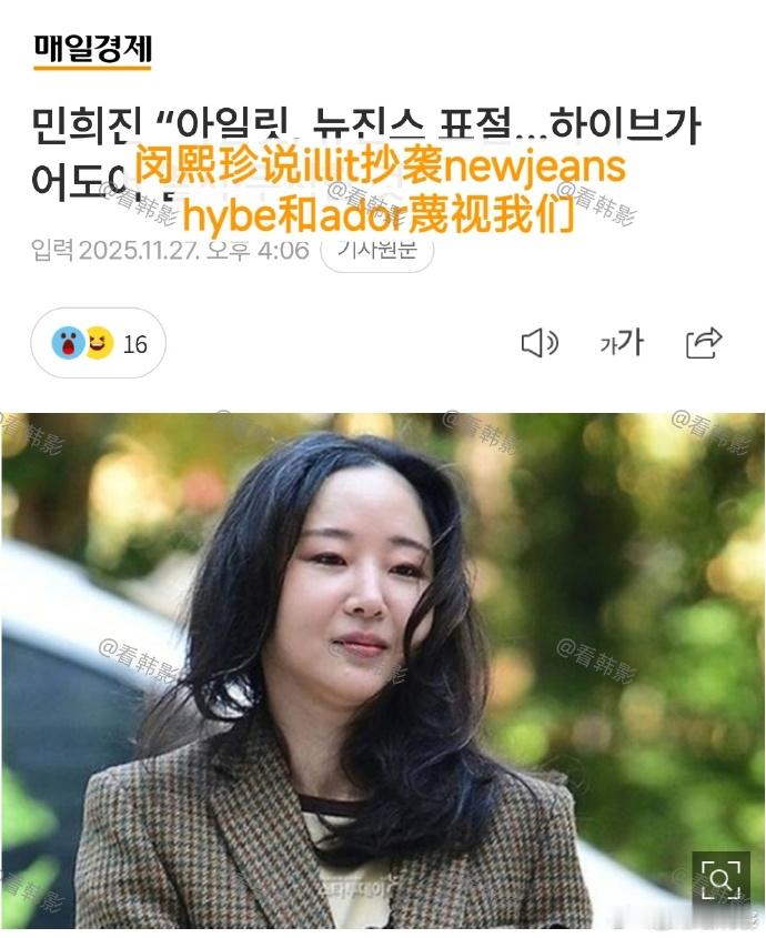 闵熙珍称illit抄袭newjeans闵熙珍称hybe蔑视newjeans 据韩媒,闵熙珍今天在法院说ILLIT抄袭newjeans,还说Hybe简直是蔑视我们! 闵熙珍:illit出道预告出来时,newjeans的父母就给我打电话怀疑。说「怎么没有我们家孩子」,也就是说她们和newjeans如此相似。他们是在蔑视我们,觉得我们又多么可笑啊。