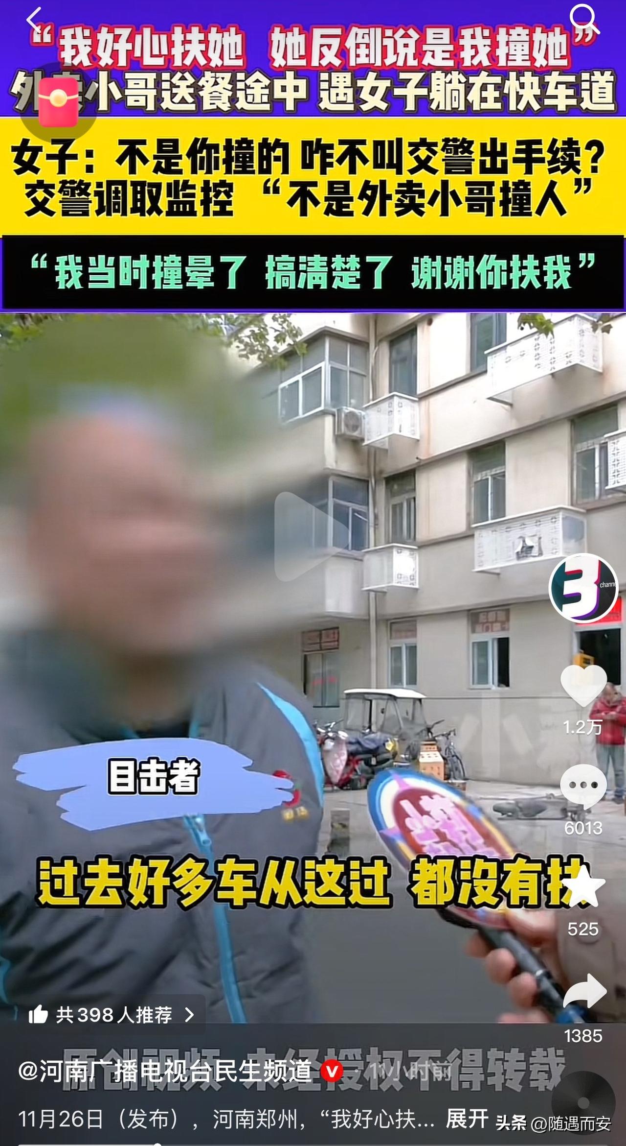 “我好心服扶她,她反手说是我撞的,我太冤了!”河南郑州,外卖小哥送餐途中,看到女