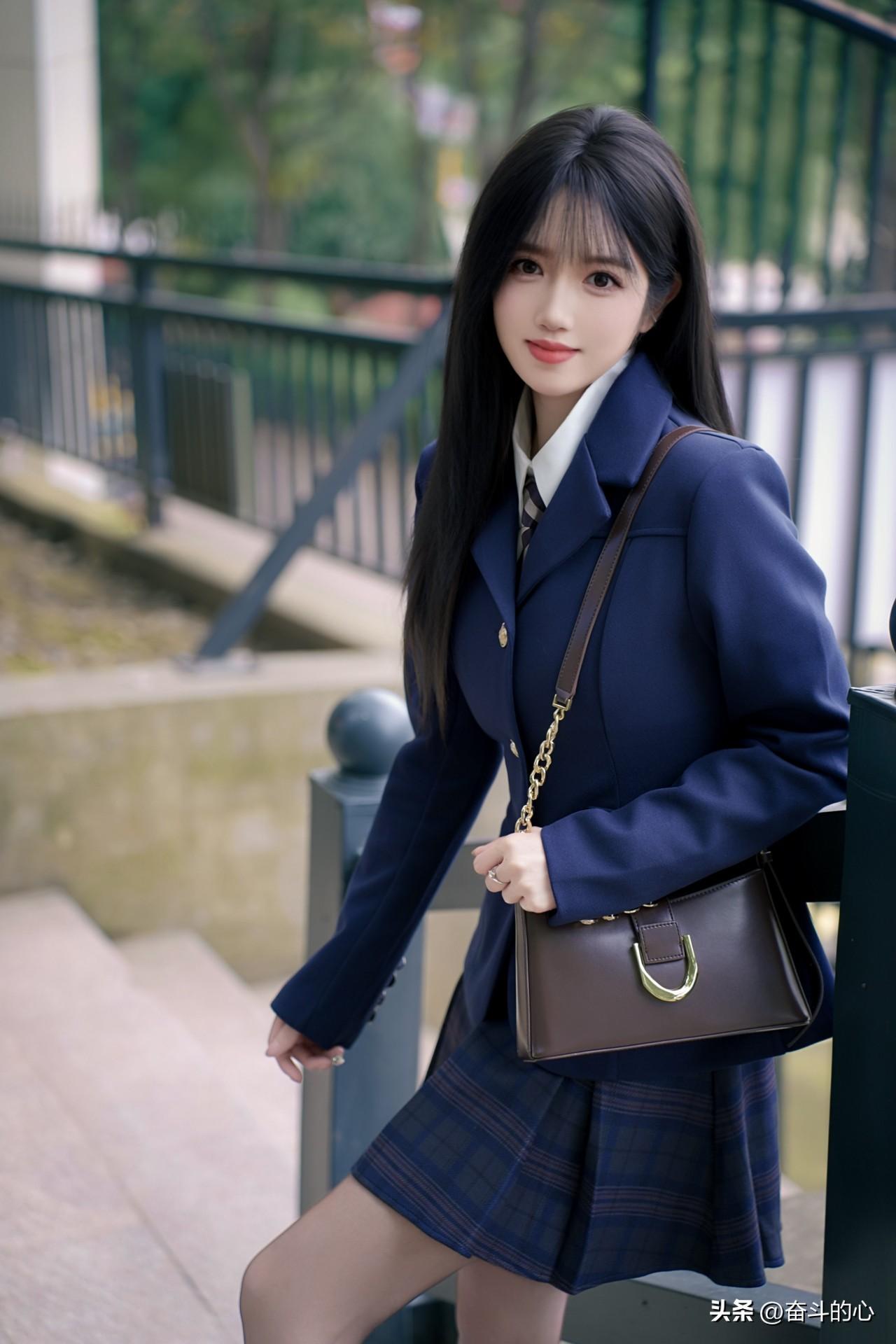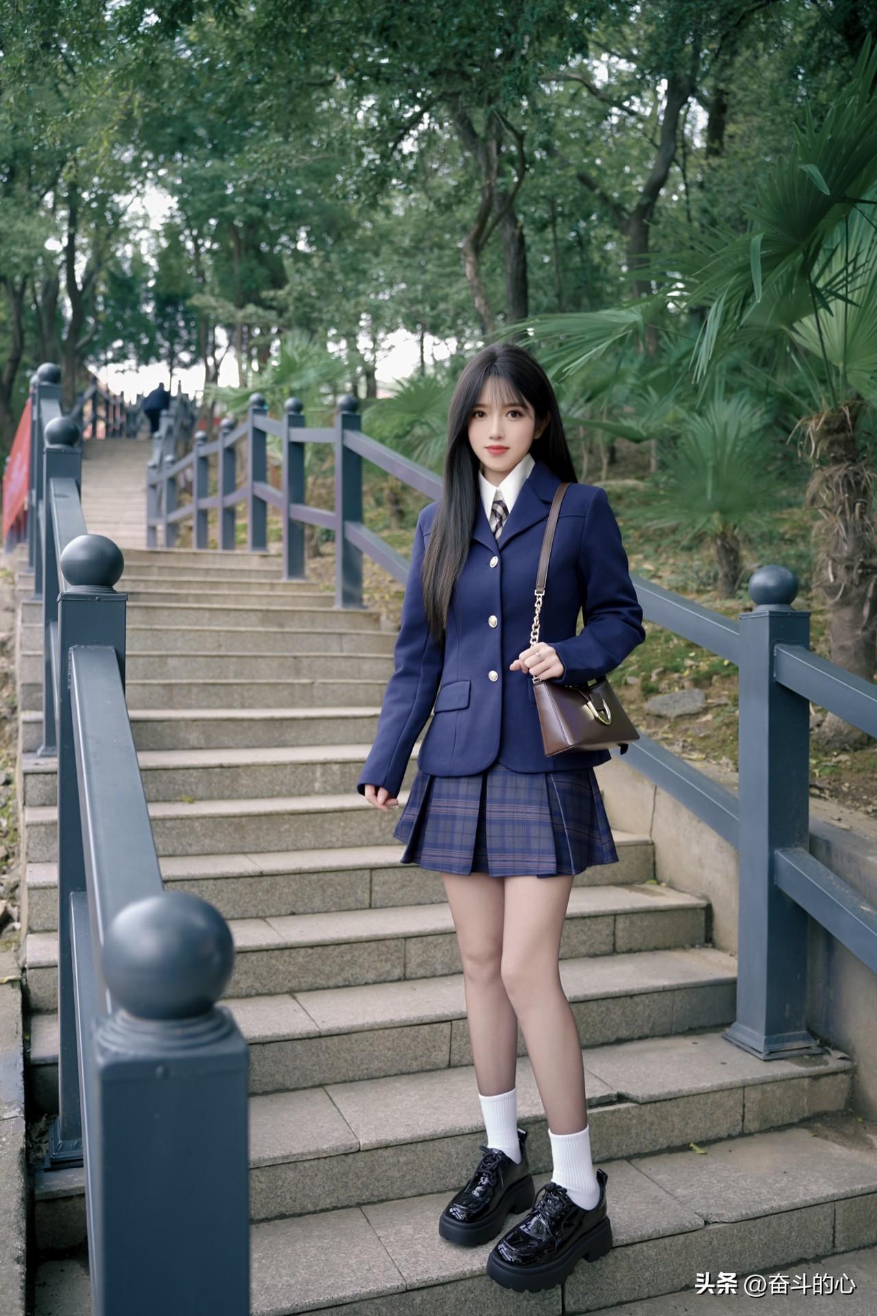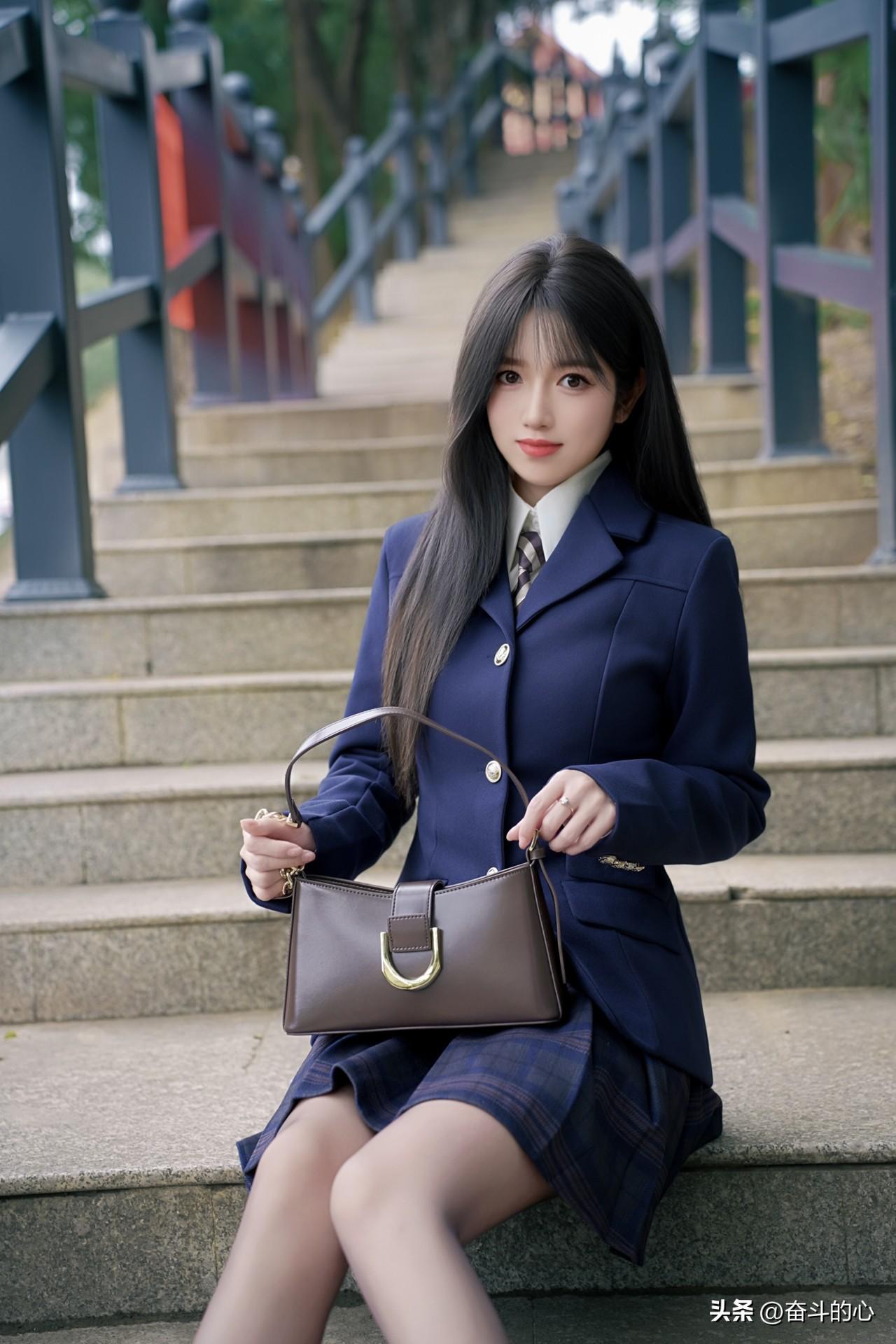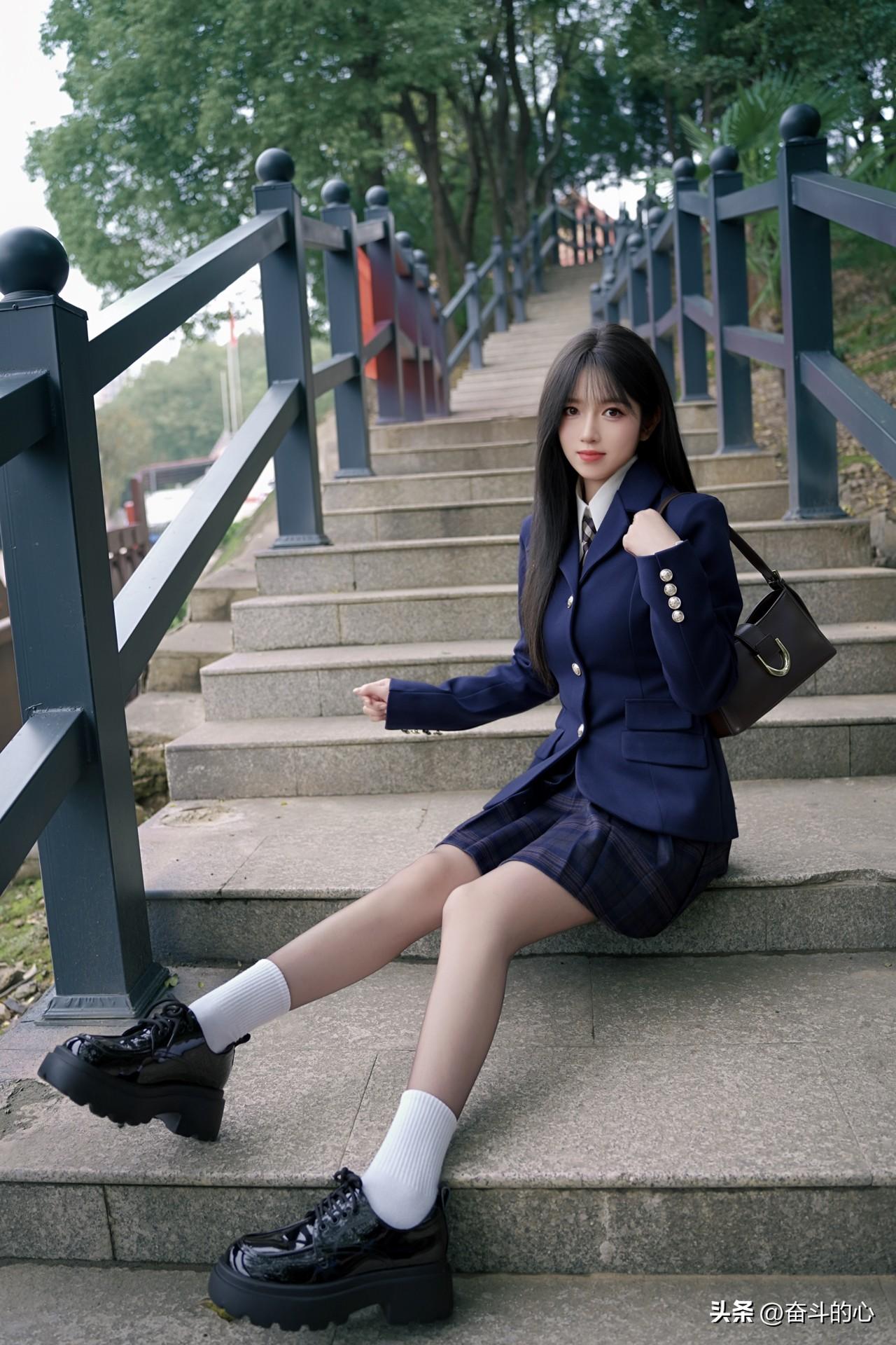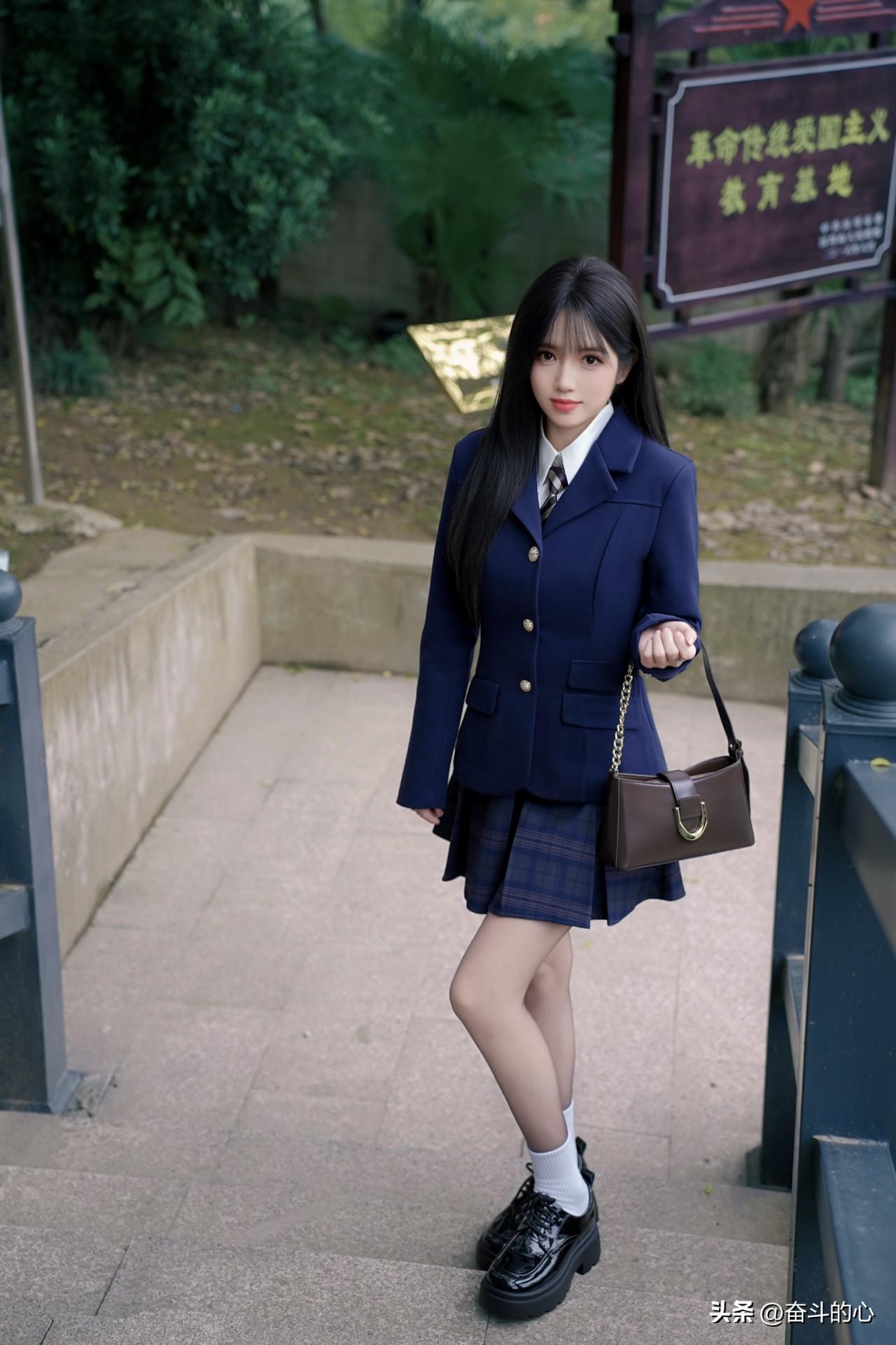 被这套绀色JK西装杀疯了!! 西装版型好正,绀色显贵气又衬肤色,搭配同格百褶裙,校供感直接拉满~内搭白衬衫+格纹领带,细节感拉满,背个棕咖色小皮包,学院风里又带点轻熟感✨ 厚底小皮鞋+白袜,显腿长还巨显嫩,在公园的石阶上拍,像从日漫里走出来的学姐🎬 日常通勤或和姐妹逛校园穿,被问了N次链接,JK党闭眼冲这套!”