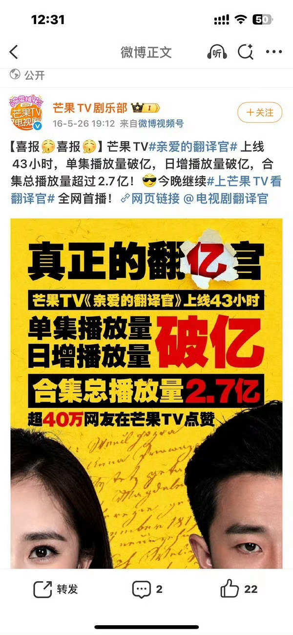 原来杨幂《亲爱的翻译官》的收视率不仅是2016年央卫年冠,网播还是芒果史冠!芒果tv没下架的时候播放量102.6亿,乐视视频2023年的时候已有60.8亿,腾讯有博主统计版权期3.2亿!