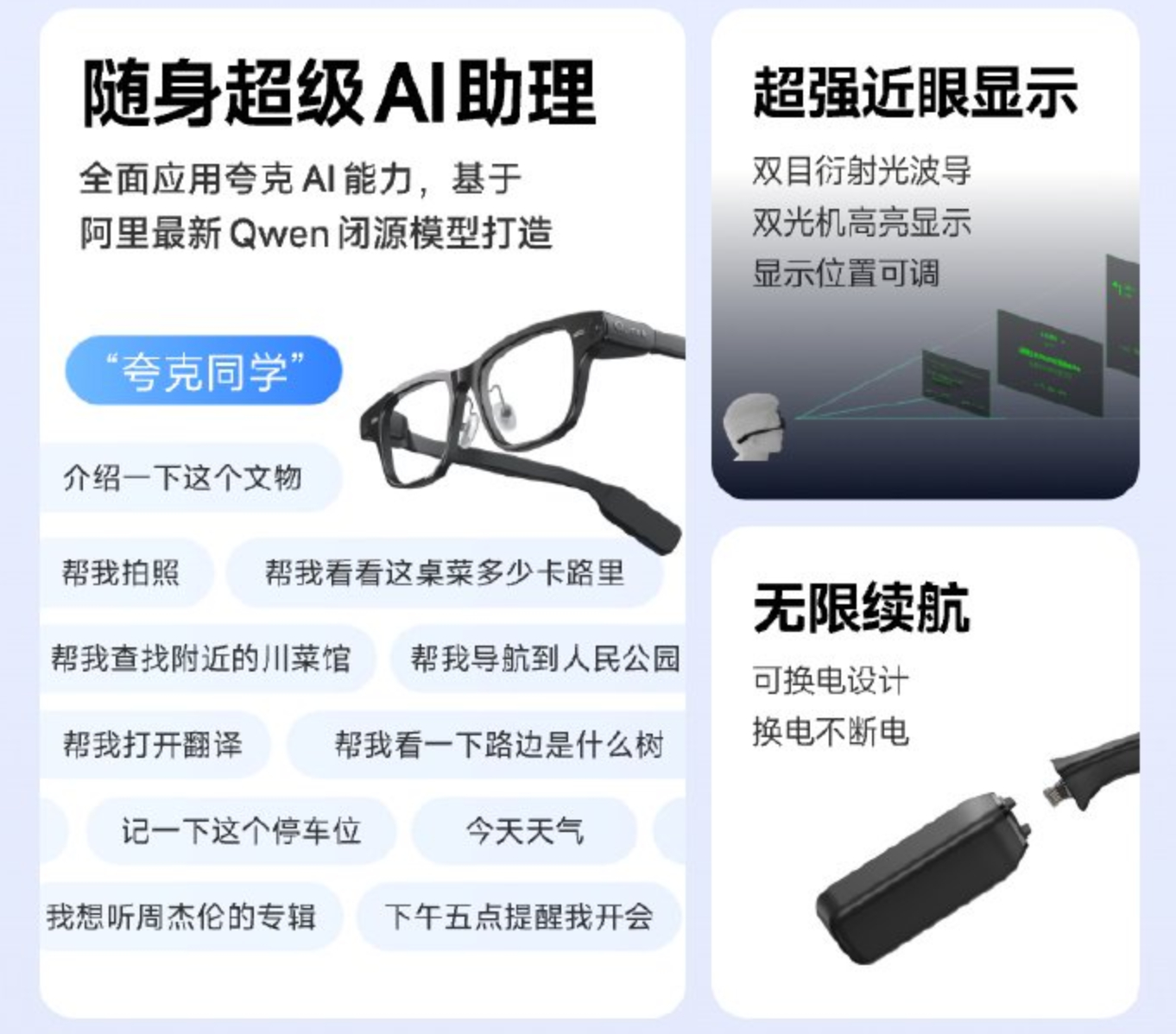 夸克AI眼镜带来的行业利好 说真的,AI眼镜这条赛道之前争议挺大——概念火、产品虚、体验不落地。但这次夸克AI眼镜发布会,我感觉行业真的被拨动了一下。最直观的变化是 从“玩具”迈向“工具”。无论是 基于高通平台的AI算力、还是 JBD的微显示光学方案、立讯的整机设计和制造能力、康耐特的镜片与调光技术,都说明产业链已经不是拼噱头,而是实打实把真实体验做上去了。再加上生态端 支付宝、高德、飞猪、拍立淘 的加入,AI眼镜第一次有了能真正替代手机部分场景的可能。抬头就是导航、看一眼即可支付、旅途中信息实时调取,不是炫技,是真的很实用。我的眼镜已经在路上,到手给开箱实测。大家最想看哪个场景?是通勤导航、旅行拍摄、还是实时翻译?