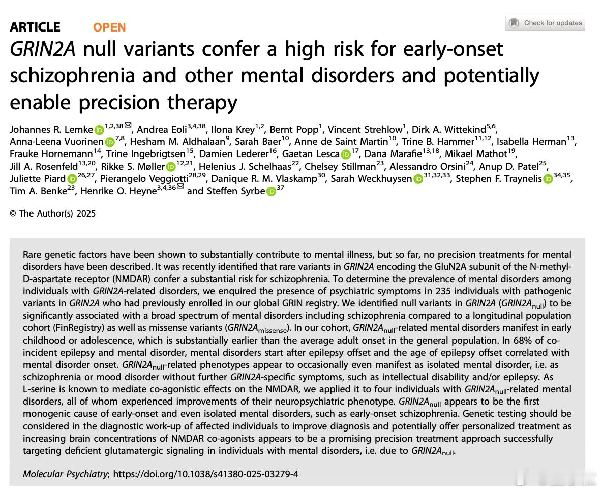 抑郁症由单基因引起科学家首次证实单基因致精神病科学家首次发现,单个基因变异就能直接引发精神疾病。以往精神疾病如精神分裂、焦虑、抑郁等,普遍被认为是多种基因和环境因素共同作用的结果。但一项由德国莱比锡大学医学中心主导的研究指出:GRIN2A基因的“Null变异”(即功能完全丧失)可能是已知首个可以独立诱发精神疾病的单基因变异。这项研究整合了全球GRIN2A突变携带者的数据,总样本数达235人,是目前全球最大规模的相关队列。研究发现:- GRIN2Anull携带者患精神疾病的风险是GRIN2Amissense(错义变异)携带者的6.5倍;- 近六成在15岁前发病,远早于常见精神疾病的成人发作高峰;- 高发精神疾病包括精神分裂症(风险比高达87倍)、情绪障碍(11.8倍)、焦虑症(5.8倍);- 有6位携带者仅出现精神症状,无癫痫或智力障碍,说明GRIN2A变异可导致“非综合征型”的单基因精神病;- 多数患者的精神症状在癫痫结束后才出现,提示潜在的“疾病接力”机制。研究还提出了一个可能的干预方向:L-丝氨酸补充治疗。 L-丝氨酸是一种可转化为D-丝氨酸的氨基酸,而后者是NMDAR(一种调节神经信号的受体)的协同激动剂。GRIN2Anull变异会导致GluN2A亚基功能缺失,造成NMDAR活性下降、神经信号失衡。补充L-丝氨酸,有望恢复NMDAR通路的功能。在4位接受L-丝氨酸治疗的GRIN2Anull患者中,均出现了明显改善,包括幻觉消失、妄想减少和行为控制提升。研究者呼吁,早发精神疾病患者应纳入基因检测流程,精神病学诊疗应结合精准医学新路径。这项发现,不仅挑战了传统“精神病一定是多基因”模型,也为“单基因精准干预”打开了新思路。研究团队表示,这是一个起点,后续还需更大样本、更长追踪期来验证疗效与机制。原文:scitechdaily.com/scientists-identify-first-ever-single-gene-that-can-directly-cause-mental-illness/