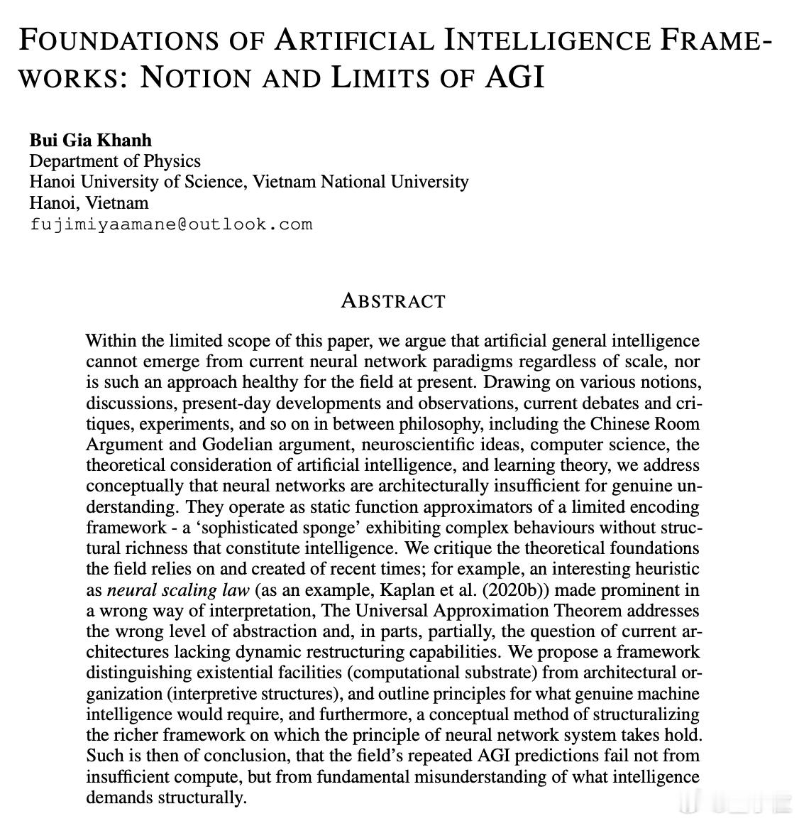 给AI泼盆冷水AGI或许永远无法实现当所有人都在期待新模型发布时,一篇题为《人工智能框架的基础》的论文给行业泼了一盆冷水。作者Bui Gia Khanh在论文中提出了一个尖锐的观点:不论模型做得多大,目前的AI架构可能永远无法产生真正的通用人工智能(AGI)。他认为现在的AI模型,本质上是一块复杂的海绵。目前的神经网络(Neural Networks)和大型语言模型(LLM),在训练时像海绵一样吸饱了数据,使用时再挤出相关信息。它们表现得很有逻辑,但这是一种静态的模仿。一旦训练结束,模型的大脑就被冻结了,无法像人类一样实时重构认知结构来适应完全未知的领域。所谓的Scaling Law,可能只是工程学错觉。行业内普遍迷信大力出奇迹,认为只要堆算力、堆数据,智能就会涌现。但这篇论文指出,这就像试图造一把梯子去月球。无论梯子造得多么精致、多么高,它在结构上就决定了永远伸不到月球。目前的模型只是优秀的插值机器,在已知范围内表现完美,但缺乏真正的推理能力。重点说说中文的房间困境。作者引用了经典的哲学实验:如果一个不懂中文的人关在房间里,仅仅依靠一本完美的规则书来回复外面的中文纸条,外界会以为他懂中文,但他实际上只是在查书。目前的AI就是那个查书的人,它处理的是符号,而不是意义。论文建议,未来的AI研究不应只关注把模型做大,而应该转向设计能区分生存设施(计算基底)和操作设施(思维过程)的新架构。这并不是要否定AI的价值,而是提醒大家,我们可能正处于一种统计学的魔术中。要实现真正的智能,可能需要换一条路走了。原文链接:arxiv.org/abs/2511.18517