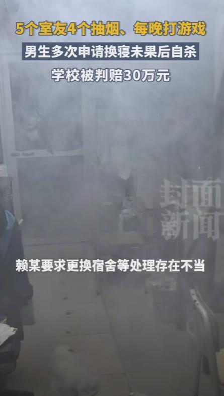 江西赣州,一学生宿舍5名同学,其中4名整天抽烟打游戏。一名同学受不了要求换寝未果,选择投河,学校赔偿30万。网友:不光学校有责任,负责人也要受到惩罚! 赖某满心欢喜的踏进新校园,期待自己期盼已久的大学生活。 刚报到那天,他热情的跟每一位舍友打招呼,还把宿舍收拾的个干干净净。 本以为美好的校园生活就此开始,可没多久赖某却整天闷闷不乐。 他们宿舍一共住了5个人,除他之外全都抽烟,每天宿舍里都是烟雾缭绕,赖某经常被呛得直咳嗽。 到了晚上,别的宿舍都关灯休息,赖某的宿舍却依旧灯火通明。 舍友们集体打游戏,抽着烟打游戏,刺鼻的味道加上聒噪的声音让赖某难以入睡。 两个星期后,忍不下去的赖某找到辅导员:“我要求换宿舍,我实在受不了了。” 辅导员简单安抚他的情绪,还让他学会跟舍友好好沟通,此后就没了下文。 后来的那段时间,赖某三番两次找辅导员,请求换宿舍,甚至说出:“再不换我就去跳了”这样的话。 可惜种种求救信号都没得到校方的重视,愤懑绝望的赖某选择投河自尽。 好不容易抚养长大的儿子遇到这种事,赖某的父母悲痛欲绝,无奈之下将学校告上法庭。 后来学校被判因处理不当存在过错行为,赔偿30万元。 一个年轻的生命就此逝去,不少网友感到惋惜,替赖某觉得不值,何必为了这点小事丢了性命。 也有的不少人讨伐辅导员的做法,说他不作为,漠视学生的要求,但凡当初他能积极解决问题就不会是现在的结果。 成为舍友之前,大家都互不相识,有矛盾很正常,学生解决不了向外寻求帮助也没做错。 学校应当积极处理学生的问题,而不是再三推脱,视而不见。 希望学校能多多关注学生们的心理需求,从底层解决问题,避免类似事情再次发生。