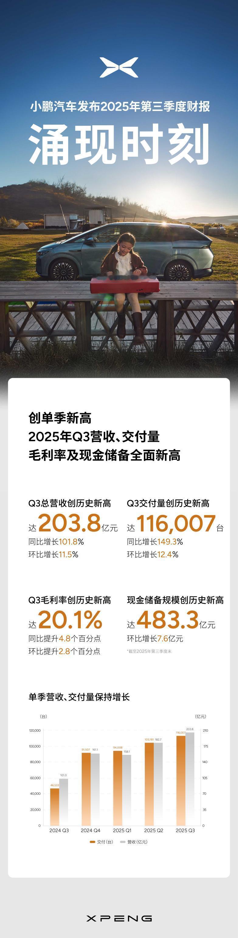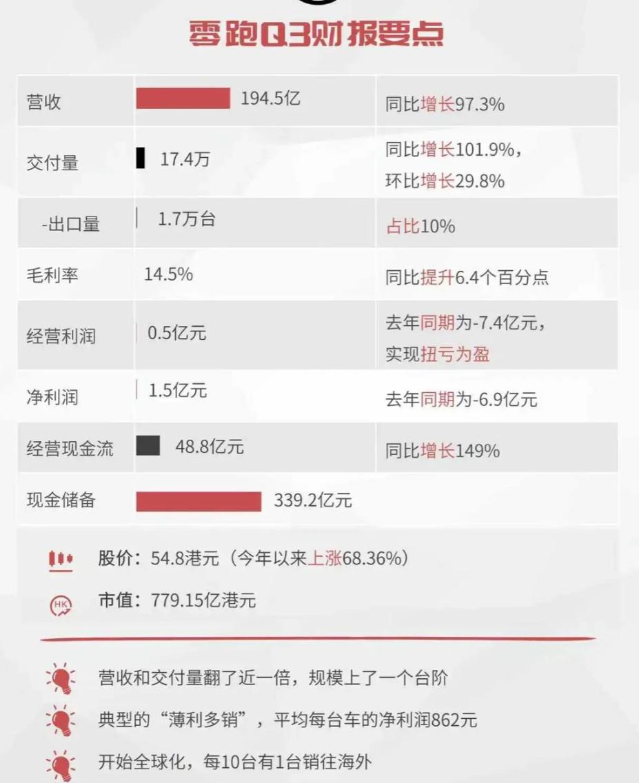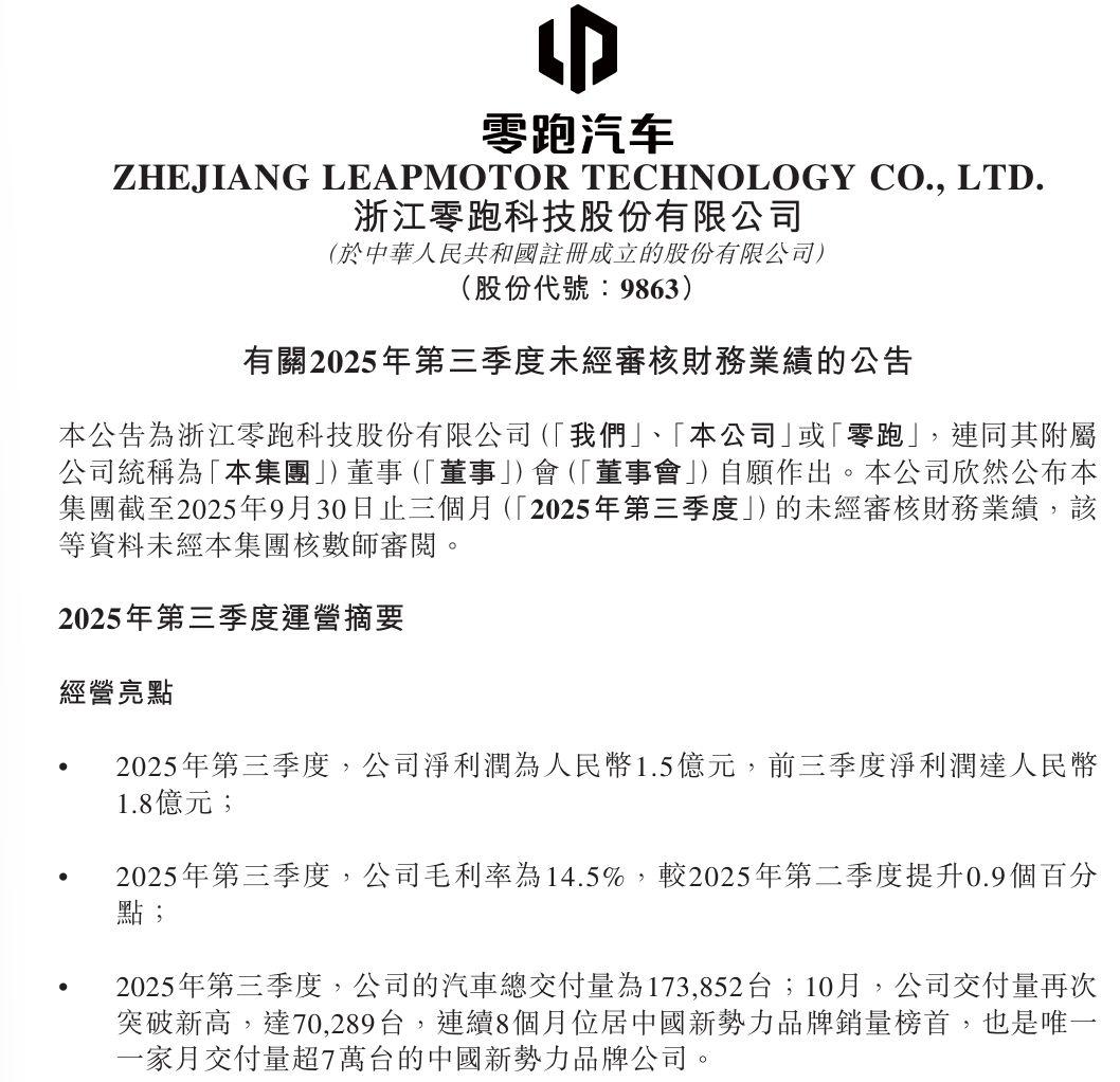 新势力三季度财报陆续公布,零跑成唯一盈利的头部品牌? 近段时间新势力陆续公布的Q3财报,可以说有喜有忧。其中令我十分惊喜的就是零跑,它的财报在蔚小理零中应该说表现是最好的,因为在蔚来、小鹏和理想的营收均超200亿元情况下,净亏损却高达34.8亿、3.8亿和6.24亿,反观零跑在营收194.5亿元基础上,实现了1.5亿元净利润,成为这四家头部新势力当中唯一三季度盈利的。 大家要知道在如今激烈的竞争环境当中,能实现1.5亿净利润,营收、销量均实现接近翻番的增长有多难,14.5%的毛利率同比大增6.4个点,充分体现了零跑对产品定价与成本控制的能力,更凸显全域自研模式的盈利潜力,在同行过分依赖外购核心部件分薄利润时,零跑已将技术自研红利转化为实打实的盈利空间。 更何况还有339.2亿在手资金,为企业提升抗风险能力,为研发与全球扩张提供保障。当然,我觉得浙江省持续不断的给零跑投资,也为零跑的稳健发展构建了“双保险”。 这份财报的含金量,本质是技术垂直整合模式的胜利,更彰显零跑在产品矩阵完善、海外加速布局双重加持下,盈利韧性持续增强。四季度在月销超7万的开门红引领下,零跑的盈利曲线有望再创新高!