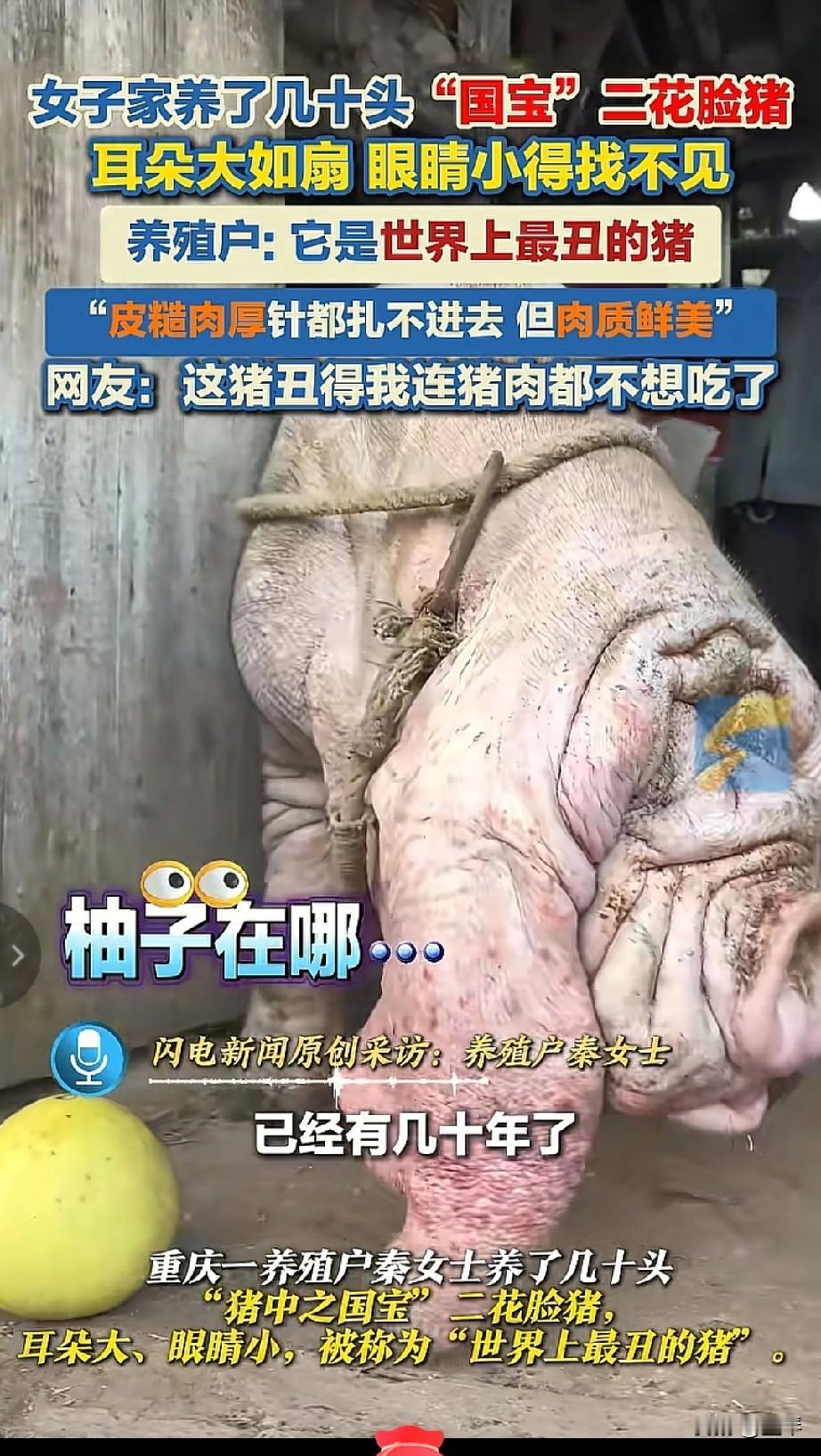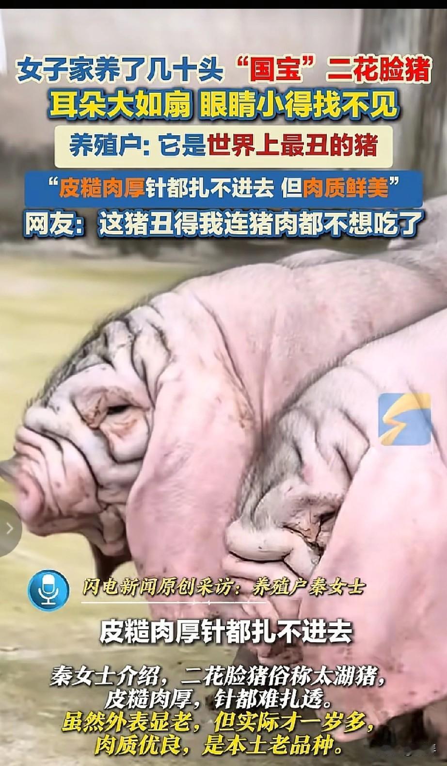 你见过世界上最丑的猪吗?来,今天就让大家开开眼看下图。[灵光一闪] 这猪往这一站,直接把“颜值盆地”焊死在身上了—— 耳朵大得能扇风,耷拉着把小到看不见的眼睛遮得严严实实;满脸褶子比我太奶奶的皱纹还密,皮肤糙得像裹了层老树皮,养殖户秦大姐都直言:“这就是世界上最丑的猪!” 但你敢信?这“丑东西”是正儿八经的猪中“国宝”——二花脸猪(太湖猪的一种)。 别看它1岁多就长得像“猪界百岁老人”,皮糙肉厚到针都扎不透,人家可是**“产仔王”+“肉中贵族”。 一胎能生十几只崽,最高纪录42头;肉里带着天然的香,肌间脂肪裹满嫩肉,一口下去能香到舔盘子。 网友吐槽“丑得不想吃猪肉”,但懂行的早把它当宝贝:毕竟这猪2005年纯种只剩35头,现在是国家一级保护猪种,有钱都不一定能吃到。 所以说,丑归丑,人家是“实力派丑星”——丑得独特,香得靠谱! 晒图笔记大赛丑猪