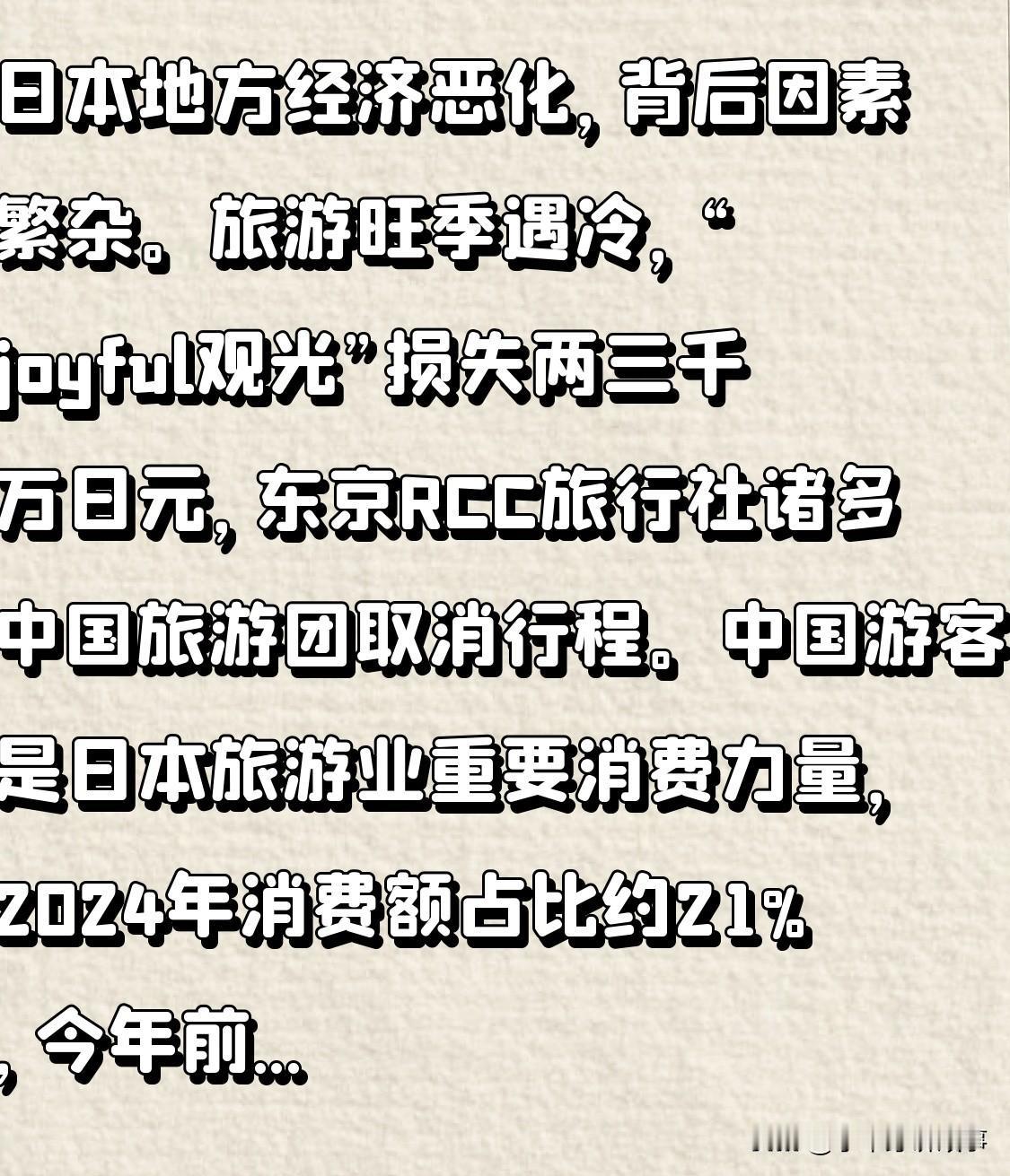 日本地方经济恶化,背后因素繁杂。旅游旺季遇冷,“joyful观光”损失两三千万日元,东京RCC旅行社诸多中国旅游团取消行程。中国游客是日本旅游业重要消费力量,2024年消费额占比约21%,今年前9个月升至24%,其流失让日本旅游业损失惨重。 这与日本政客倒行逆施脱不了干系,首相高市早苗涉台错误言论冲击中日关系,游客转而前往东南亚。资本市场已有反应,日企股价受影响。虽有企业集团和农协兜底未现社会动乱,但日本地方经济恶化难掩。