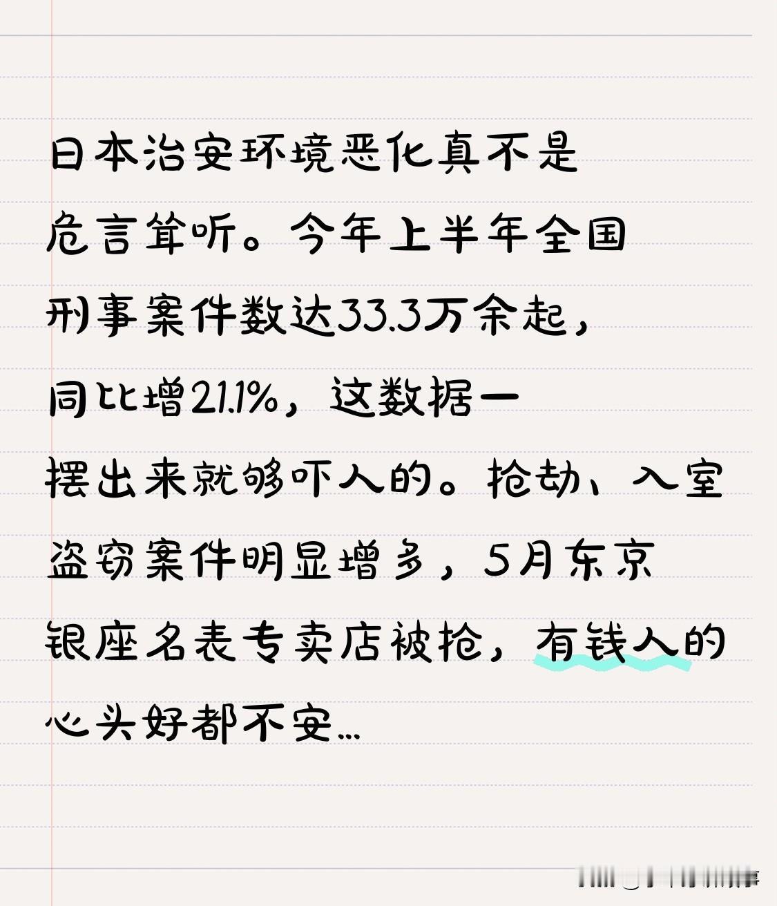 日本治安环境恶化并非危言耸听。今年上半年,全国刑事案件达33.3万余起,同比增21.1%,数据惊人。抢劫、入室盗窃明显增多,5月东京银座名表店被抢,富人所爱也不安全。 因人口减少、空宅增多,入室盗窃激增,某县前5个月空巢民宅盗窃案是去年同期4倍。更可怕有无差别袭击,2025年长野、埼玉等地事件频发,民众惶恐,日本难安心生活。