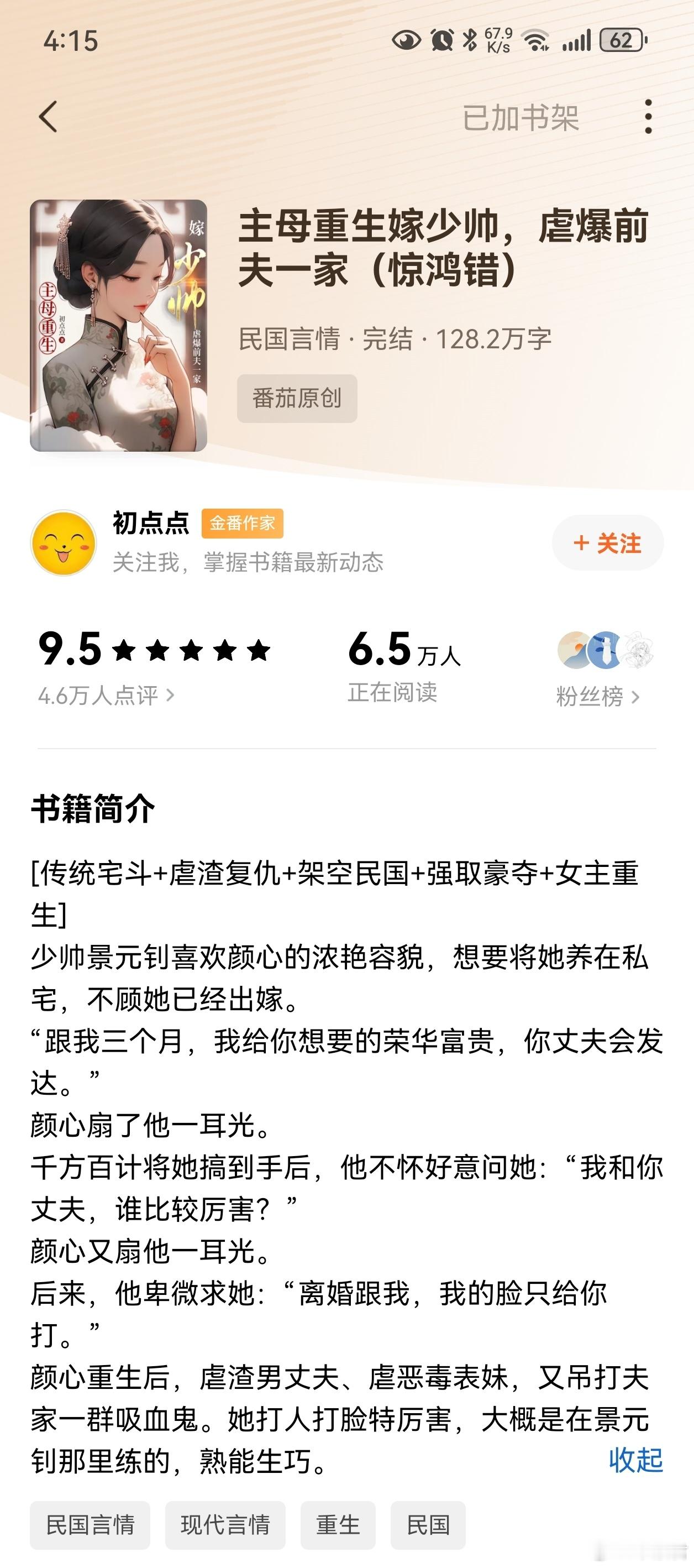 主母重生嫁少帅,虐爆前夫一家还不错,看完了,民国文,女主重生,算是开了金手指,女主前世真的太惨了,总之方方面面的惨,重生后就变得很厉害,就是想不明白前世这那么圣母成那个样子番茄好文言情小说推荐推文