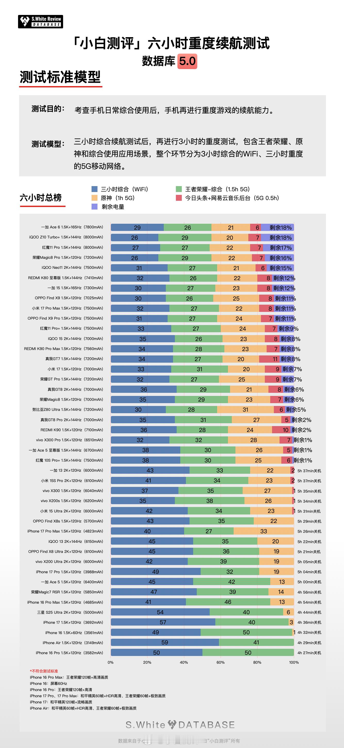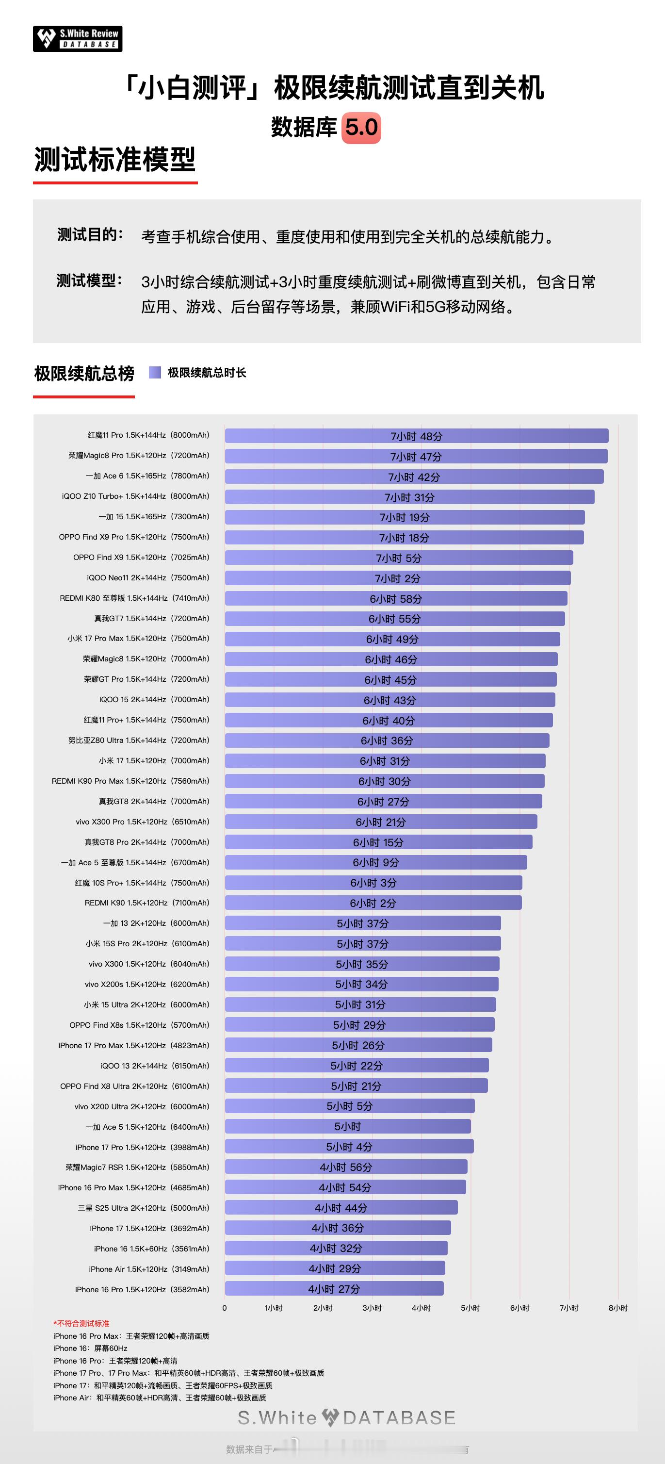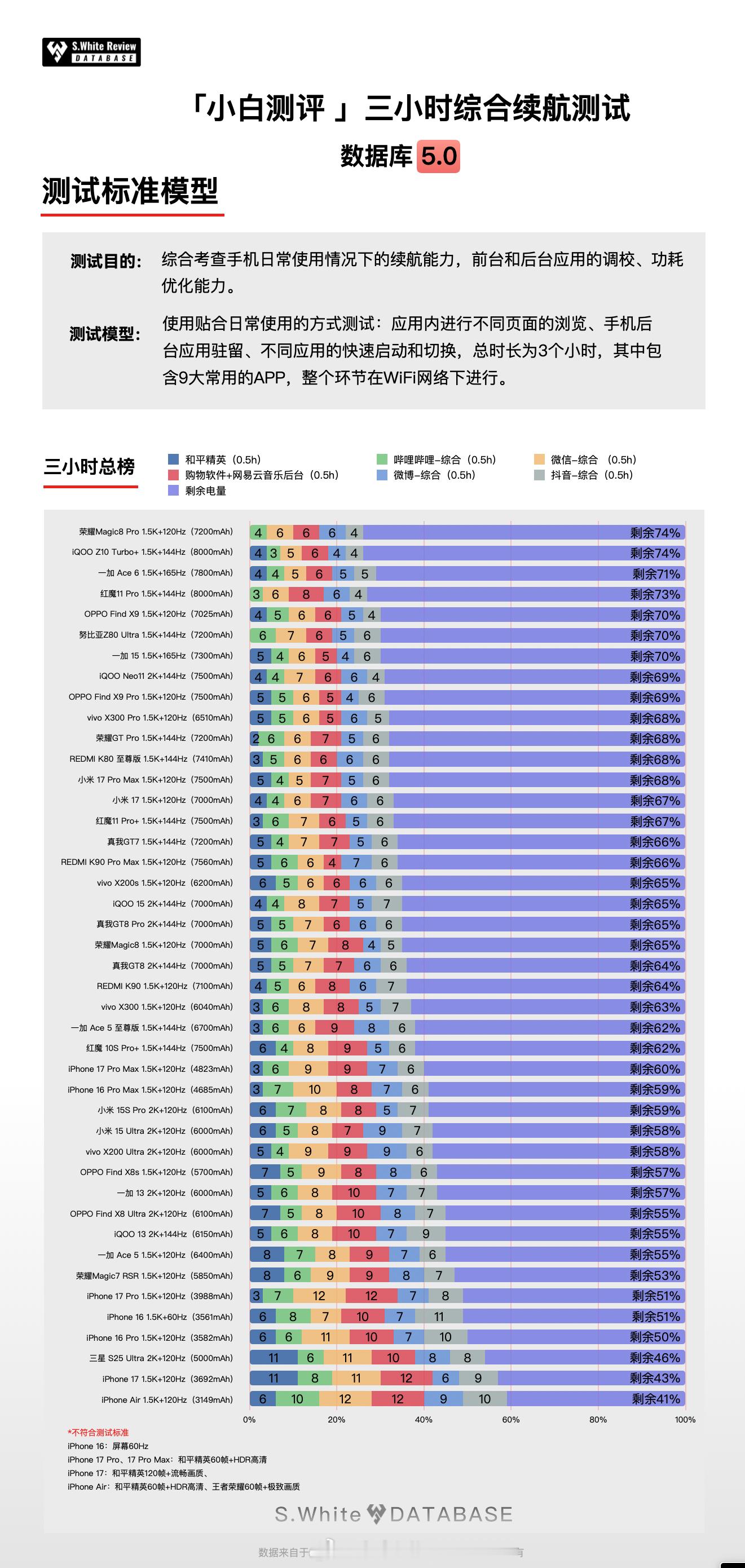 你现在的手机日常续航怎么样?数据库最近一个月陆续开展了《子品牌旗舰横评》、《中端横评》和《标准版旗舰横评》等项目,基于新版本重新测试了红魔11 Pro+、iQOO 15、真我GT8 Pro、红米K90 Pro Max、一加15、小米15、vivo X300、荣耀Magic8、OPPO Find X9、iPhone 17、红米K90、真我GT8等机型续航成绩,成绩请查看配图。PS.可多关注小程序,“最新动态”会公告数据更新情况。小白测评数据库5.0 环境温25℃±0.5℃,屏幕亮度350nits,全新机械臂操作、高速相机进行数据采样