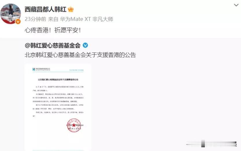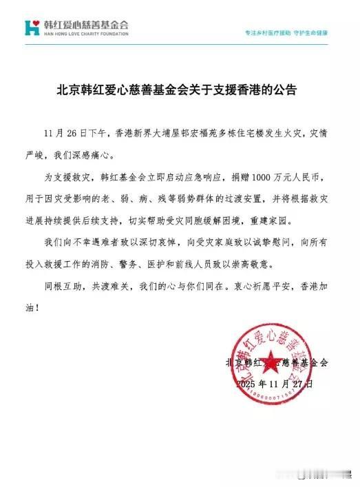 11月26日香港新界大埔屋邨宏福苑多栋住宅楼火灾,韩红基金会反应超快,马上启动应急响应,直接捐了1000万元人民币。这笔钱主要用于受灾的老、弱、病、残等弱势群体过渡安置,而且后续还会根据救灾进展持续提供支持。 在灾难面前,韩红基金会的行动太暖心了。这不仅是金钱上的援助,更是一份对受灾同胞的关怀。希望这笔善款能让受灾群众尽快缓解困境,重建家园。也向所有救援人员致敬,大家一起加油,香港一定能挺过去!