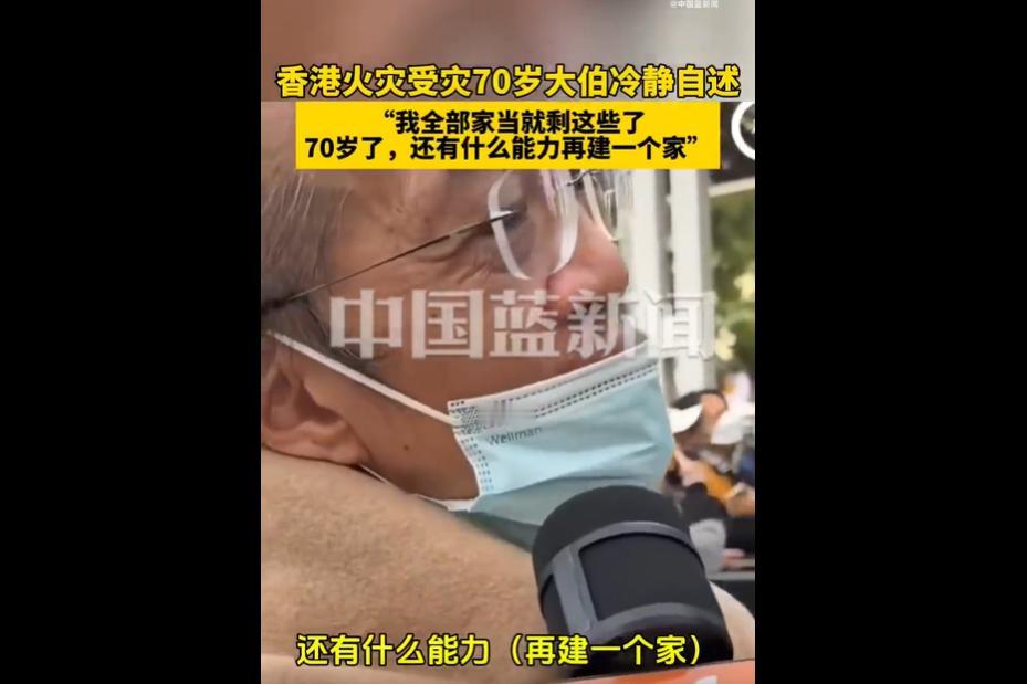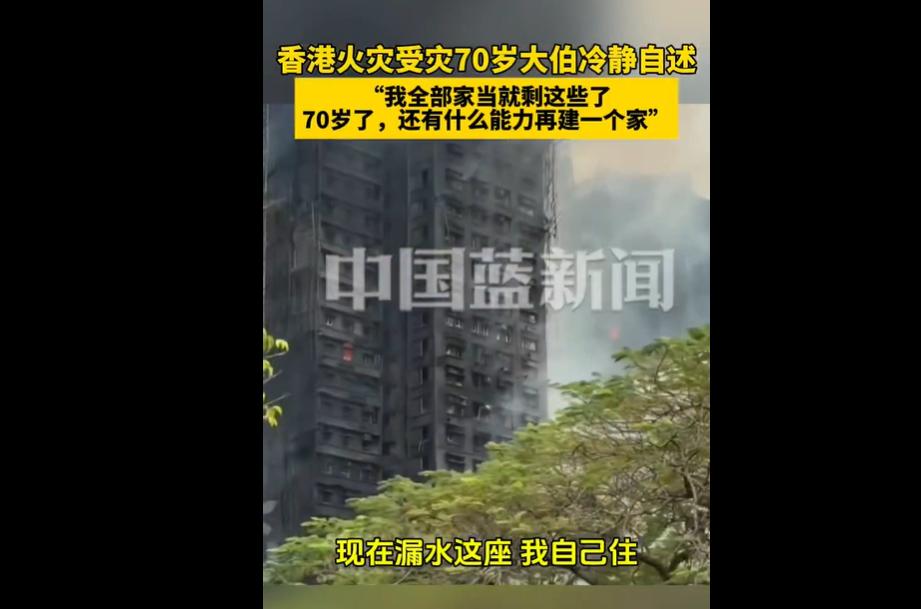 香港宏福苑火灾已致 55 人遇难,70 岁的李大伯在此居住 30 余年,起火时因上班幸免于难,却痛失所有家当,仅余随身物品。 他平静坦言 “70 岁已无力重建一个家”,戳中公众泪点。 受灾长者们不仅失去了花费十几万元维修的房屋,更焚毁了数十年的生活记忆与情感联结,陷入精神归属感真空。 这场大火简直是 “岁月小偷” 的终极版! 李大伯 30 年的家当、满屋子的回忆,转眼被烧得精光,一句 “无力再建一个家”,平静得像在说别人的事,却比号啕大哭还戳心 ——70 岁的年纪,哪还有力气跟灾难 “掰手腕”? 那些没 “回本” 的维修费、亡故伴侣的遗物、子女成长的痕迹,烧的哪里是房子,是老人一辈子的精神寄托啊! 还好特区政府设了庇护中心,社会各界也纷纷捐钱捐物,算是给冰冷的灾难添了点暖意。 繁华都市的光鲜背后,高龄群体面对灾难本就 “扛不住”。 希望这份援助能持续到位,别让老人的 “无力” 变成 “无助”,也愿这场大火能敲响警钟,让城市对长者多些兜底的温暖,毕竟家没了,能重建的信心和底气可不能再丢了!