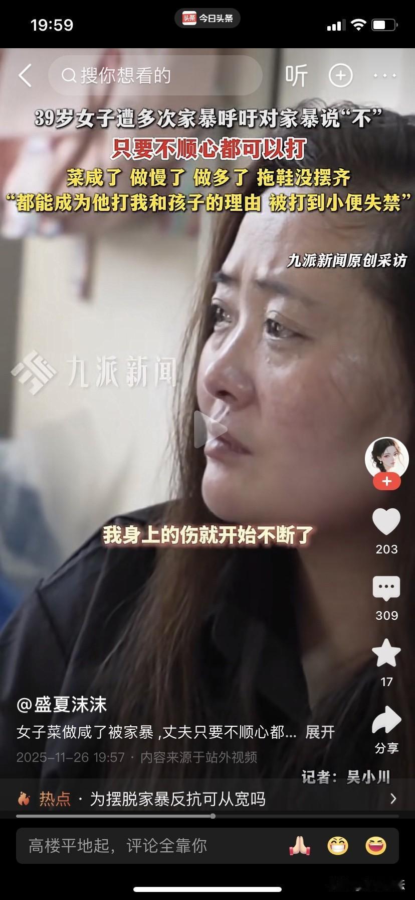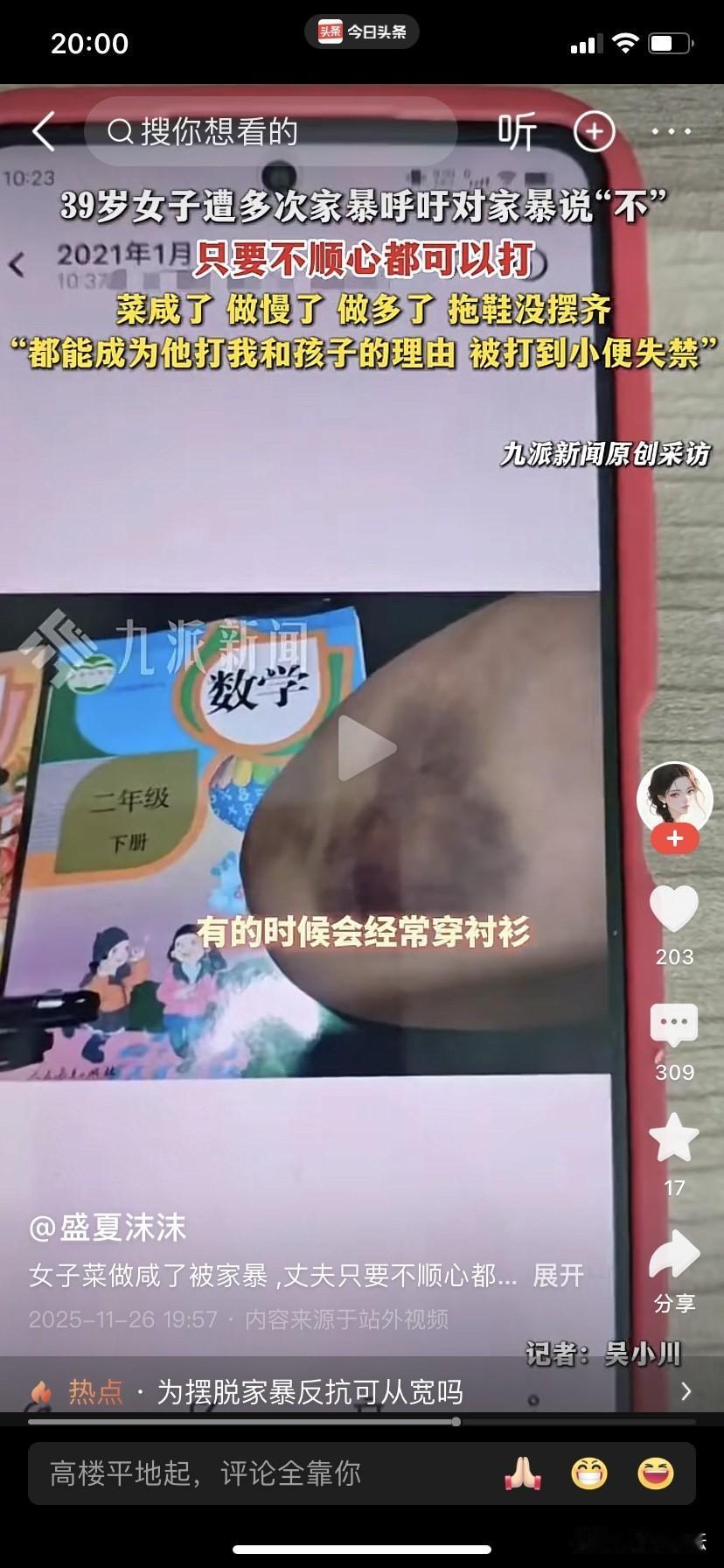 太气愤了,辽宁大连一男子长期家暴自己的妻子。 2025年11月25日,一位来自辽宁,大连的桑女士爆料称:自己今年39岁。有一个正在上二年级的孩子,平日经常因为一些小事遭受丈夫家暴。就连平日一点儿小事也会遭到丈夫的家暴。比如菜咸了,做慢了,做多了或者拖鞋没有摆整齐都要遭到丈夫的毒打,总之丈夫只要不顺心就开始打。从2020年起自己的身上自己身上的伤就没有断过,经常是旧伤还没好又添新伤,曾经被打的小便失禁。如果商女士报警,丈夫会在警察到来之前把地上的尿擦干净,装着像什么事也没发生一样。 有许多案例表明:凡是打老婆的男人都是渣男都是没有能耐的男人,自己没有本事把家务事处理好,一点小事就拿老婆出气,遇到这种男人不管他的家庭有多富有,家庭背景有多高贵,为了保命赶快离婚,勇敢地对家暴行为说:不。对家暴行为采取零容忍。因为生命只有一次,不要再一棵树上吊死,女人要学会保护自己,女人不要总是依靠男人,要学会自立,离开男人也能很好的生存,这样,那个男人也不敢欺负自己。[祈祷]个人观点仅供参考。欢迎大家在评论区聊一下您的想法,共同为这位女士出出主意。