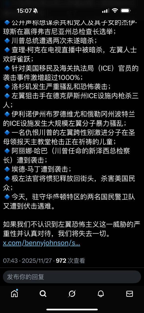 光天化日之下,在白宫附近枪杀两名国民警卫队士兵的凶手,确认为拜登政府在2021年放进来的阿富汗穆斯林非难民,在行凶之前,他高喊"真主至大"。马斯克怒火中烧,愤而发文:"向今天被冷血杀害的两名国民警卫队队员的家属致以我最深切的哀悼。还要再有多少无辜者死去,我们的破碎体系才会被改革?我们必须采取激进行动了!"