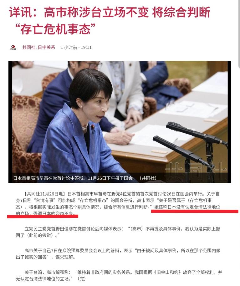 高市早苗变本加厉:不承认台湾属于中国 据日本共同社报道,当地时间26日,高市早苗首次与4位在野党党首在国会内举行党首讨论。关于引发中方愤怒的言论,她声称,自己只是在被问到具体问题时进行了诚实作答,是否构成“存亡危机事态”将根据具体情况具体判断。立民党党首野田佳彦事后告诉媒体,他觉得高市早苗的这种说法,是实际上撤回了言论。 这女人太会装了,明明就是故意挑事,现在被中方怼了,就拿“被提问”当借口,说什么“根据具体情况判断”,这纯属胡说。 野田佳彦还帮着圆场,说她这是“实际撤回言论”,这哪叫撤回啊?连句认错的话都没有,分明是想蒙混过关,当咱们眼瞎吗? 台湾是中国的地盘,这是刻在骨头里的事实,跟谁说理都站得住脚。 早在上世纪四十年代,《开罗宣言》《波茨坦公告》就明明白白写着,日本得把偷去的台湾还给中国,后来日本投降也是签了字认了账的。 1972年中日建交的时候,日本政府更是白纸黑字承诺,承认台湾是中国领土的一部分,这四份政治文件有国际法效力,不是随便就能赖掉的。 现在高市早苗倒好,直接无视这些,还拿个咱们根本不承认的《旧金山和约》说事儿,说日本“没有认定台湾法律地位的立场”,这不就是明着不承认台湾属于中国吗? 她心里打的什么算盘,谁都清楚。 之前就敢说“台湾有事”可能是日本的“存亡危机事态”,暗示要动武介入,现在又变着法儿模糊台湾的定位,就是想为日本武力干涉台海留口子。 这已经不是简单的“言论不当”了,是赤裸裸地干涉中国内政,挑战咱们的底线。要知道,台湾问题是咱们的核心利益,跟自己家里的事儿一样,轮不到外人指手画脚,更容不得别人想抢就抢。 更可气的是,日本政府还帮着她狡辩,说什么“立场没变”,这纯属睁眼说瞎话,中方早就说了,要他们说清楚到底认不认一个中国原则,别拿空话糊弄人,可他们就是装听不懂。 这种态度太恶劣了,根本没把之前的承诺当回事儿。 不过咱也别慌,不光咱们反对,日本国内不少人也看不过去,好几个前首相都出来批评她,说她这是在惹麻烦,历代政府都不敢这么乱说话。 还有议员直接要求她撤回言论,连普通日本民众都上街抗议,说明她这做法根本不得人心。 说句实在的,高市早苗这么折腾,就是想扩张日本军力,跟着别人后面搞事情。但她忘了,现在不是二战的时候了,中国早就不是任人欺负的样子。 咱们外交部已经说得很明白,必须收回错误言论,要是真敢动武介入,咱们绝对不会客气,肯定会拼到底保住自己的领土。 那些想搞“台独”的,还有帮着他们的外部势力,都别做梦了,台湾属于中国,这是铁打的事实,有历史管着,有法律护着,还有咱们十四亿人撑着,谁也改不了。 高市早苗现在耍小聪明,想模糊态度蒙混过关,根本没用,要么痛痛快快认错撤回言论,要么就等着承担后果。 别以为装模作样就能骗过全世界,大家都看得清清楚楚,她那点小心思,就是在玩火,早晚得烧到自己。 咱们普通人心里也得有数,台湾这事儿没得商量,谁想分裂自己的国家,谁想干涉咱们的内政,都是咱们的敌人。 不管是高市早苗还是其他什么人,只要敢碰这条红线,就必须付出代价。 咱们就等着看,她到底是真敢一条道走到黑,还是迟早得低头认错,毕竟事实就在这儿摆着,谁也赖不掉。 参考资料: 日本政府多次为高市错误言论狡辩,中方:行不通,日方应以实际行动体现对华政治承诺 2025-11-27 07:03·环球网