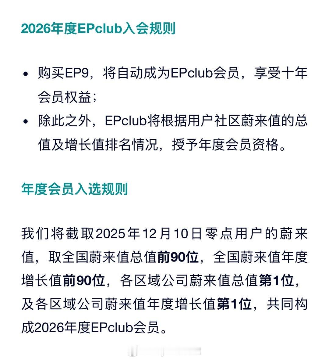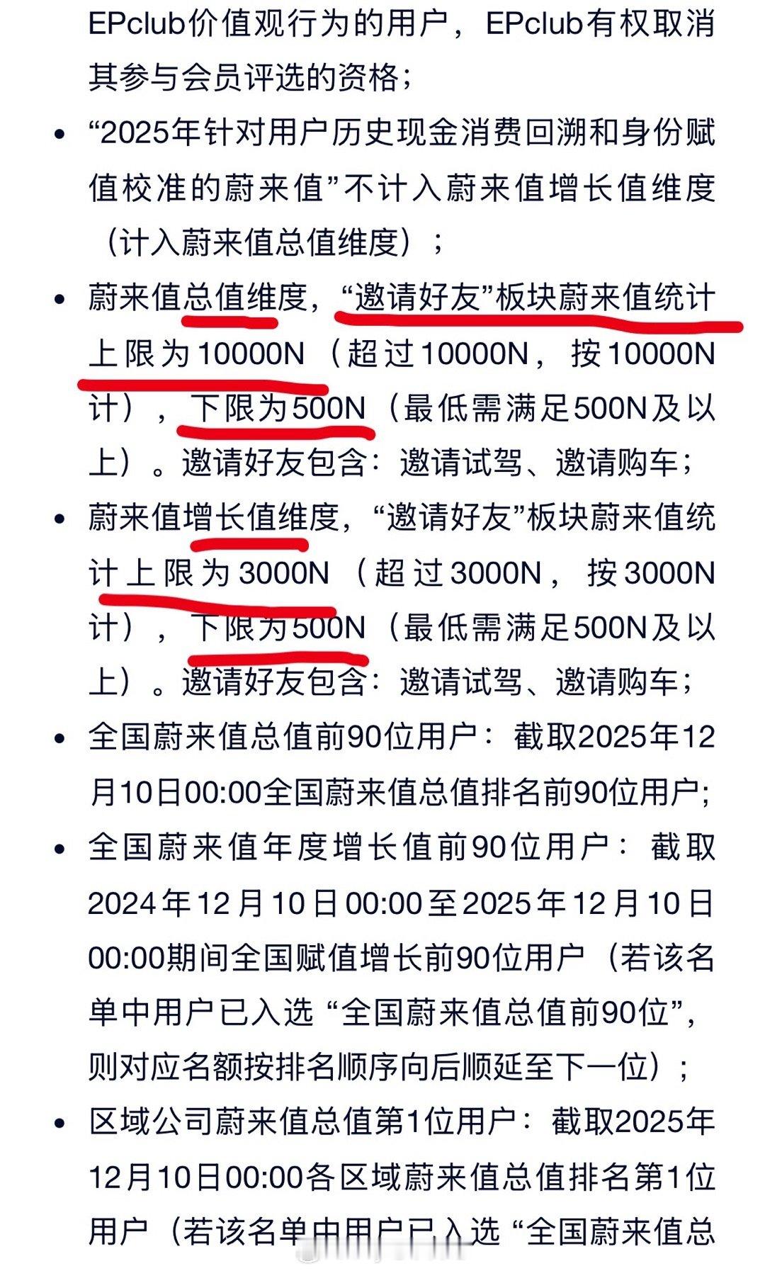 2026年度蔚来EP CLUB入会规则公布,主要变化在于:区域由“总值前3”调整为“总值第1和增长值第1”,也就是至少2人。“邀请好友购车”获得的牛值在入会规则里设置上限和下限。总榜维度上限10000N,下限500N增长维度上限3000N,下限500N简单说就是想单纯通过邀请购车进入EP的难度增加了。换句话说,想进入EP,自己多买车是最快的路子大v聊车