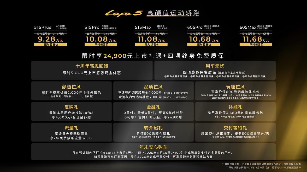 车盟快讯:11月27日零跑Lafa5正式上市,共推出了5个版型,限时惊喜价为9.28万-11.68万元。现在下订,可享受价值24900元的上市礼遇,还有四项终身免费质保。Lafa5自曝光就备受年轻消费者关注。其轿跑风格设计张扬,封闭式前脸搭配贯穿式LED日行灯,溜背曲线搭配无框车门,仪式感拉满。新车拥有同级领先的86%得房率和超80%软包覆盖率。Lafa5提供单电机后驱高低功率版本,高功率版零百加速约6.8秒。续航有515km与605km两种CLTC续航版本,还支持800V高压快充。除此之外,还配备一颗Qualcomm8650芯片,可实现高速/城市领航辅助功能。从颜值到性能,零跑Lafa5都精准击中年轻人的心,你会考虑入手吗?