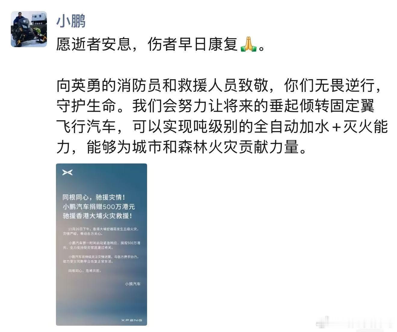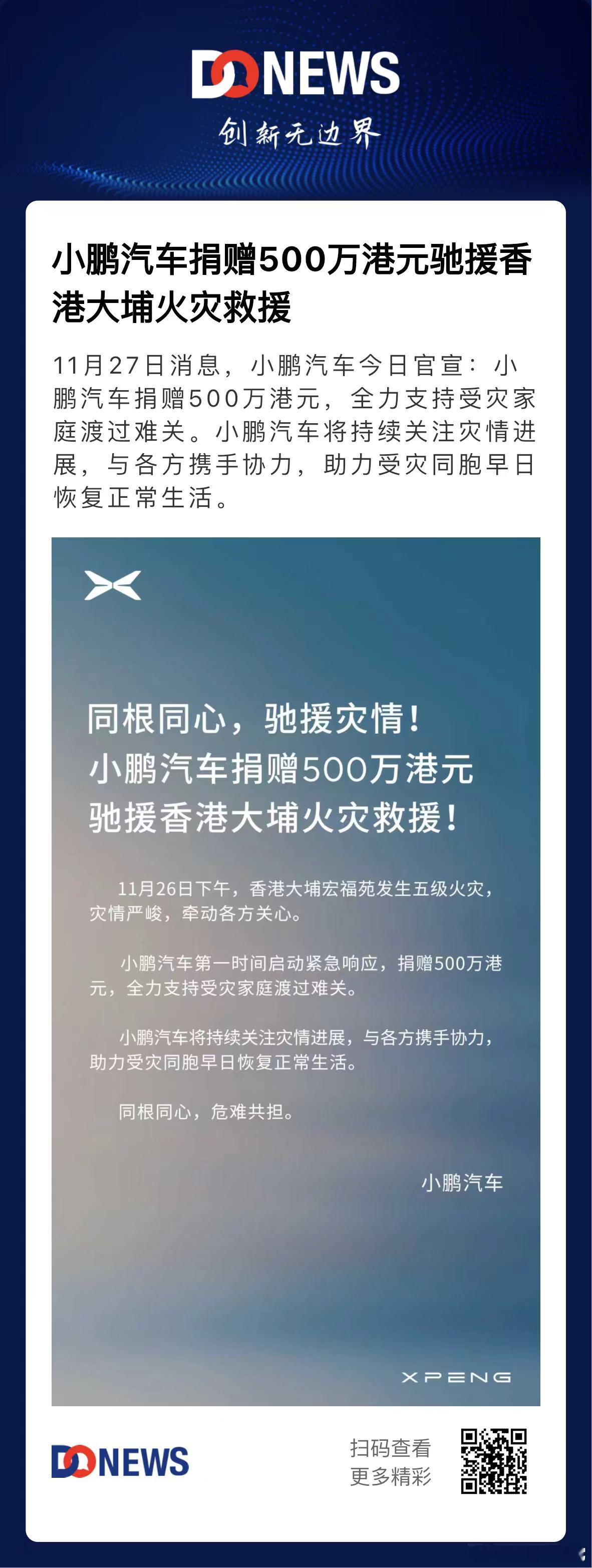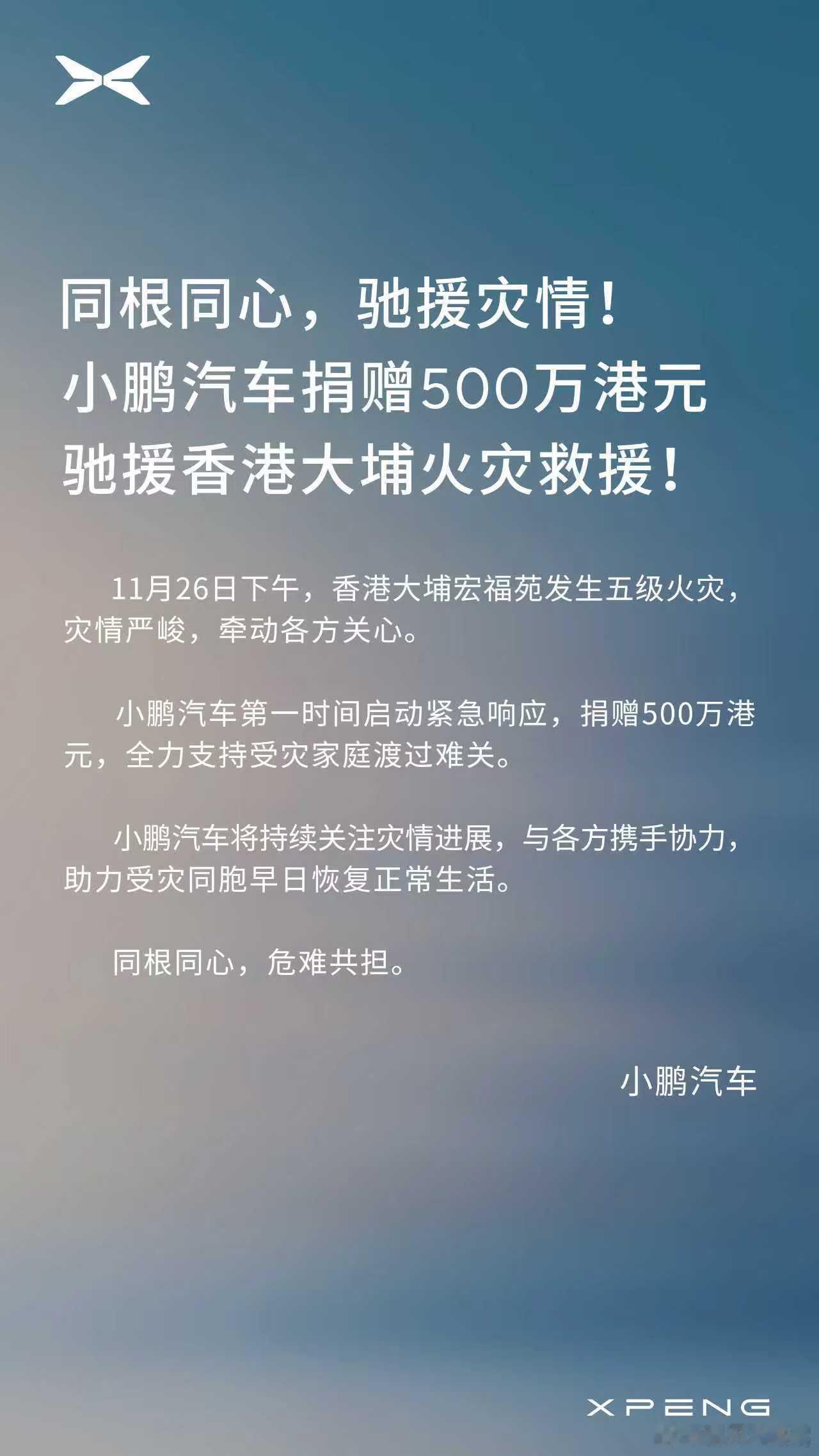 先说个人感受,受人滴水之恩,定当涌泉相报。 更何况都是华夏儿女,炎黄子孙!!个人比较喜欢看一些历史方面的东西,香港无论抗日战争时期,还是解放后,还有改革开放以后,一直是对同根同种的大陆同胞做了很多支援。 对我来说印象最深刻的是98特大洪水,因为亲身经历,所以感受特别深刻,无论普通市民还是演艺圈的明星,流露出来的感情让人不得不动容。 至于2008 年:汶川大地震(史上金额最大的香港援助)这一年香港的援助达到历史最高记录:香港特区政府捐款近 100 亿港元香港慈善机构、学校、商界、公众合计额更高参与灾后重建(学校、住房、医院等)被视为两地公益合作最具规模的一次。受人滴水之恩,定当涌泉相报。这两天看到香港大埔的大火消息,心里挺不好受的。灾难无分地域,每一条生命都值得被保护。从小时候的课本到长大后的经历,总能听到、看到香港在不同年代给予大陆许多善意与支持。人情这东西,不在于多少,而在于互相记得。所以当这次看到包括小鹏在内的一些企业主动驰援,心里还是挺感动的。一方有难,八方支援,这是我们骨子里最朴素的情感。愿所有受灾的人平安,也愿我们始终记得:无论时代怎样变,人与人之间的那份善意与扶持,永远不会过时。香港火灾香港火灾已致44人遇难小鹏汽车捐赠500万港元驰援香港
