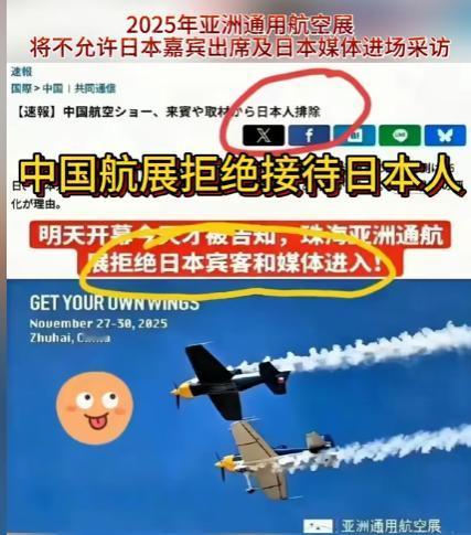 大快人心,   日本人不得入内!   据日本共同社报道,日本人将无缘参加即将在珠海开幕的2025年亚洲通用航空展。报道称,共同社的记者此前已经获得了采访许可证,但日前被主办方告知,他们的许可证已经被无效化处理,不能进入亚洲通航展。   这一消息传出后,引发了外界的强烈关注。主办方给出的理由很明确——来自“上级指示”,要求日本记者和嘉宾不得入场。这意味着,这场原本属于商业和科技领域的盛会,已经被推到了政治和安全的前沿。   回顾近一段时间,日本政坛一些人的言行频频触及中国底线,日本首相高市早苗在涉华议题上屡次发表挑衅言论,使中日关系进一步恶化。   正是在这样的环境下,珠海通航展的“限日令”才显得格外意味深长。可以说,这不仅是一次单纯的行政决定,更是一次对外政策态度的展示,上级下达的指令,正好契合了民间的普遍心声。对于很多中国人来说,这个决定来得不算早,却来得正好。   从更现实的角度看,这一做法也涉及到国家安全的考量,航空产业属于高科技领域,涉及大量核心机密和关键技术,展会上展示的飞行器、发动机、复合材料等内容,都是容易被别有用心之人盯上的对象。   近年来日本在情报搜集方面的活跃举动,让人不得不保持警惕,主办方宁可多设一道门槛,也不愿承担技术外泄的风险。把可控范围掌握在自己手里,是理智的选择。   有观点认为,这样的限制是否会影响展会的国际形象?但实际情况是,日本在通航领域早已式微,其曾雄心勃勃打造的三菱支线客机MRJ,最终在2020年被迫终止。   如今的日本,除零部件技术还残存一定优势外,几乎没有在航空整机制造领域占据一席之地。   相比之下,中国的C919和C929项目稳步推进,国产航空工业正迎来发展高峰。,正因如此,日本的缺席,并不会对展会造成实质影响,反而让外界看到一个更强势、更自信的中国航空产业。   此次禁令的真正打击对象,或许并非某几位记者,而是整个日本航空产业的市场通路,长期以来,日本一直希望借助亚洲通航展寻找潜在客户,如今通道被堵,只能眼看机会从指缝间溜走。   而这场风波,也可能成为一个新的起点。未来,中国主导的各类高科技展会、创新论坛甚至文化活动,都可能把日本拒之门外,这不仅是态度,更是一种策略。   从曾经的“华人与狗不得入内”的屈辱标语,到如今日本人被排除在中国主场之外,时代在转换,话语权也在转换。   禁止日本人入内,看似一扇门关上,实际上却是另一种自信的打开,它告诉世人,中国已经有足够的能力和底气去塑造规则、守护尊严。