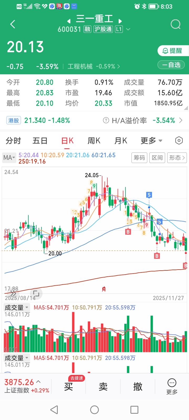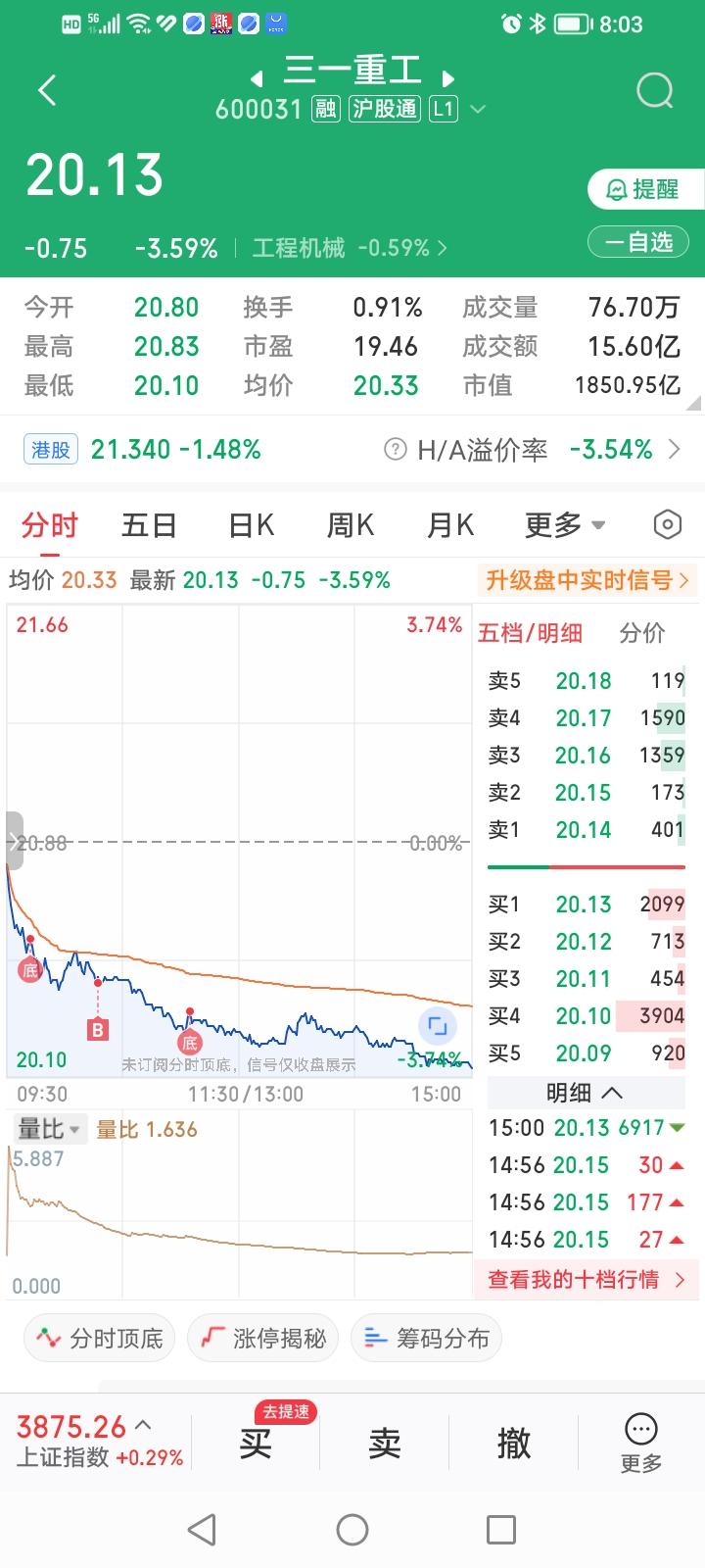 炒股软件上的什么“顶”“底”提示功能把咱害惨了!今天三一重工开盘后股价一路下跌,我比分时线提示底还低挂了0.14元挂单买入三一重工,结果买入后三一重工股价如断线的风筝继续一路下跌,收盘价20.13元,大跌3.59%,咱的买入价20.41元,被套的死死滴! 真不知道三一重工为啥H刚发完为何股价就跌跌不休?H股今天已经破发了。 真不知道炒股软件上的顶底提示功能是如何设计出来滴?为何一点都不灵? 管不住自己的手瞎买股票真的是亏损之源!咱小散的命太苦了!