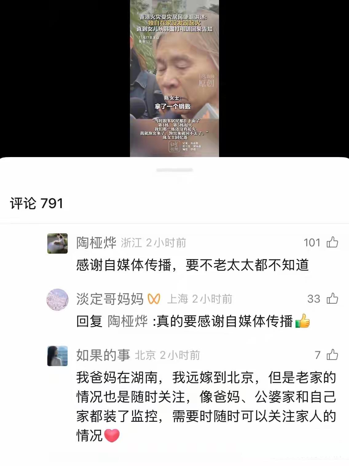 香港这次的火灾,有一位幸存下来的老太太很特殊 不是因为她多有钱,也不是因为她是某某高层 而是因为她这次获救,竟是被远在韩国的女儿给救下来的;当时她正在跟女儿通话,结果女儿忽然问她“妈,你下去看看这层楼底下是不是起火了?” 老太太听到这话,丝毫没犹豫,拿起钥匙和手机就冲下了楼;也才因此和死神擦肩而过 最开始我还觉得奇怪,远在韩国的女儿是怎么知道大楼失火了? 你肯定好奇,女儿怎么隔着千里知道火情?其实是火灾刚发生,网上就流传开了相关视频,女儿刷到后第一时间联系了妈妈。要是没有自媒体的快速传播,老太太可能还蒙在鼓里。 总有人吐槽自媒体太吵、净传没用的,但这次真的见识到了它的温度。自媒体从来不是非黑即白,它能放大恶意,也能传递生机。 关键是我们怎么用它,而不是一味否定。 你有没有刷到过自媒体传递关键信息的瞬间?来评论区聊聊~