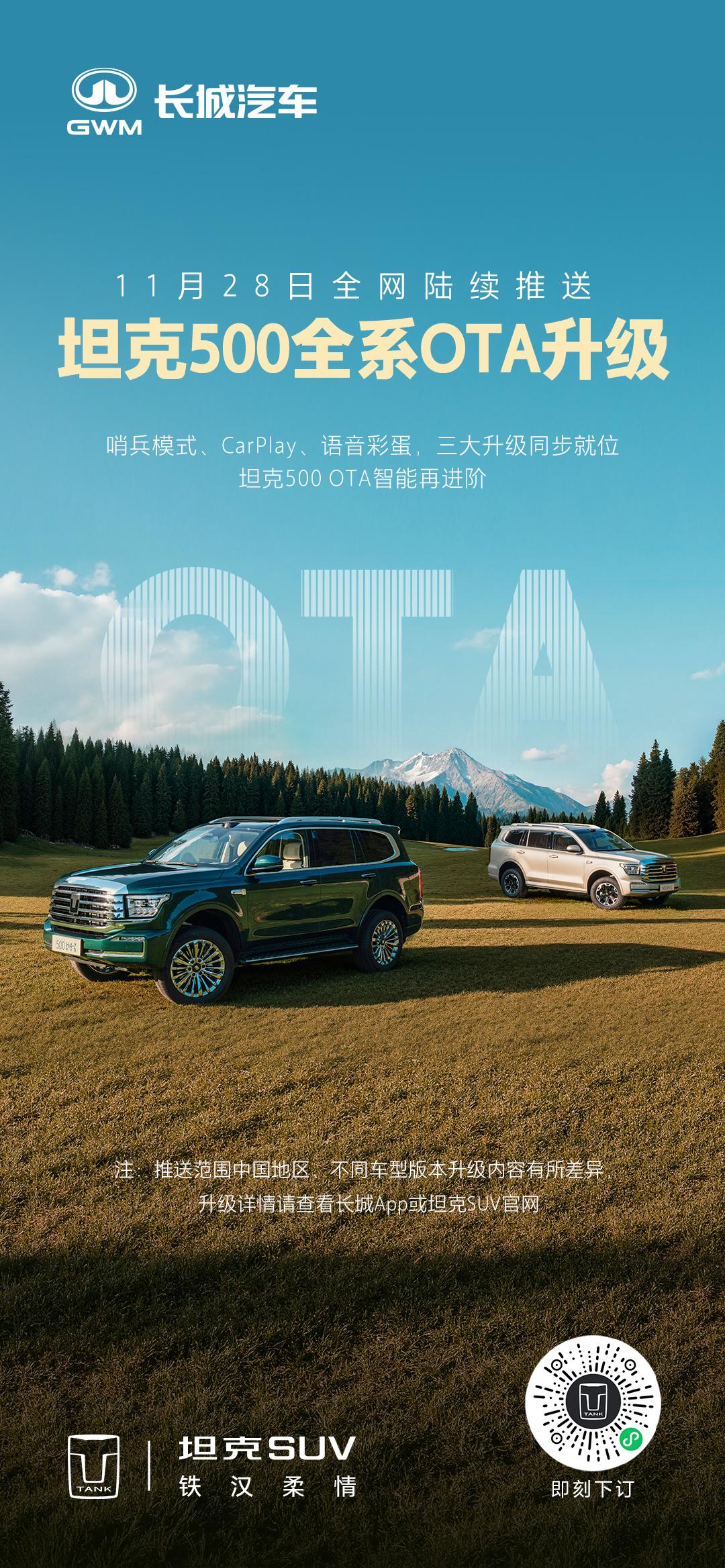 11月28日坦克500全系OTA升级开启推送!哨兵模式、Carplay、惊喜语音彩蛋给大家更好的用车体验!有生命力的坦克500坦克500OTA智能再进阶
