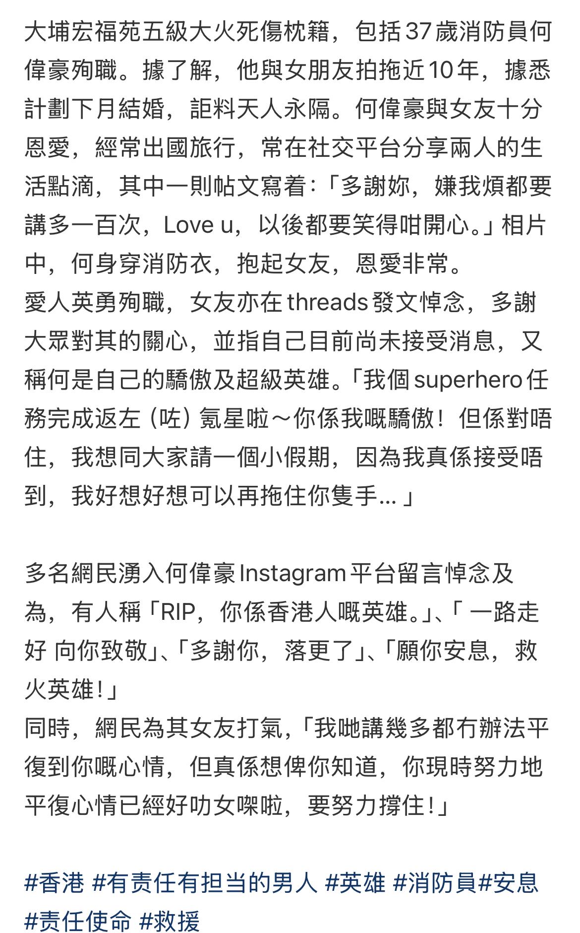 谁看了何伟豪的故事不心疼? 相恋十年要结婚的女友, 再也等不到她的superhero回家了。 37岁的他从警队转做消防员,九年坚守前线,香港火灾中首批冲进去救援,却再也没出来。 所谓英雄,就是把生的希望留给别人,把遗憾留给最爱的人。 他不是抛下女友,是用生命守护了更多家庭。 你心里的英雄,是不是都藏着这样的温柔与勇敢?