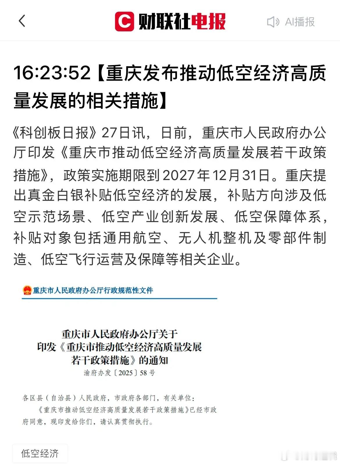 重庆重磅出手!“真金白银”补贴低空经济,这些公司将受益!重庆低空经济迎来重大政策利好!日前,重庆市政府印发了《重庆市推动低空经济高质量发展若干政策措施》。用真金白银补贴低空经济发展,政策有效期直至2027年底。补贴瞄准三大方向:低空示范场景、产业创新与保障体系,覆盖无人机、通用航空、零部件制造及运营服务等全产业链。核心受益个股梳理:· 宗申动力:重庆本地龙头,子公司宗申航发深耕航空发动机,直接受益。· 纵横股份:工业无人机领军企业,有望切入重庆低空应用场景建设。· 莱斯信息:空管系统核心供应商,已参与重庆等地低空经济发展规划。· 海特高新:深度合作eVTOL厂商,布局模拟机与适航认证,卡位培训赛道。政策力度大、目标明确,产业链公司迎来实质利好,重庆低空经济蓝图加速落地。