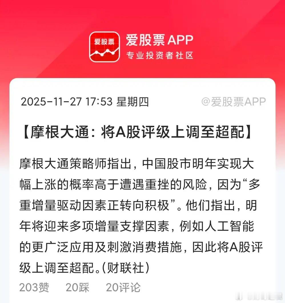 在瑞银后,摩根大通说超配中国市场,A股还有很大上涨空间!你们信不信呢?小摩给出的理由,一是明年人工智能的更广泛应用,二是刺激消费措施。也就是说,如果今年A股是强政策预期牛,那么明年就是经济复苏牛+人工智能落地牛。 但这两个都有不确定性,说牛市很容易,但想走出牛市需要资金!外资赶紧来A股。