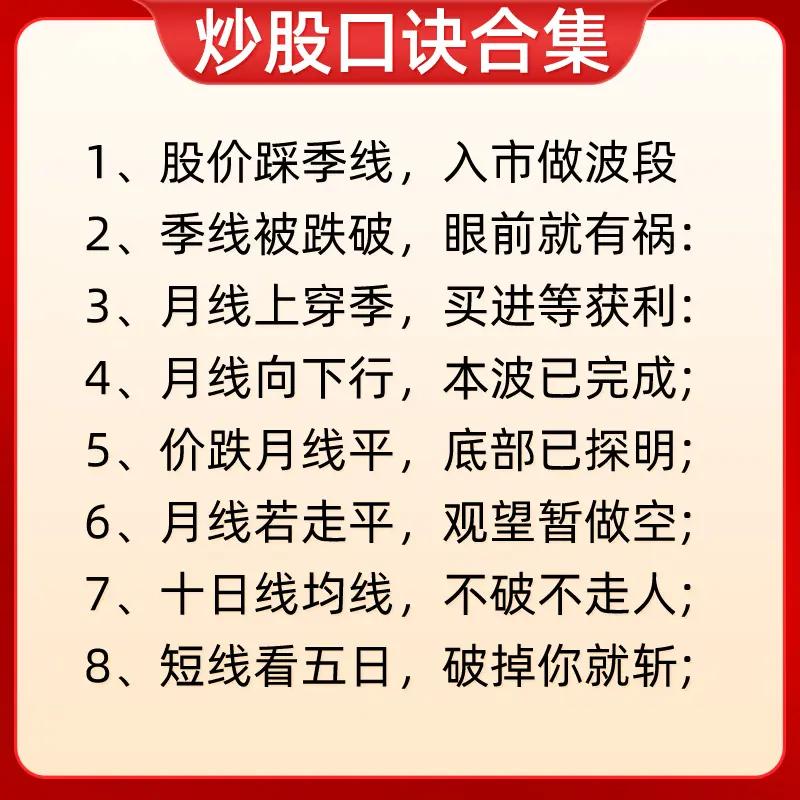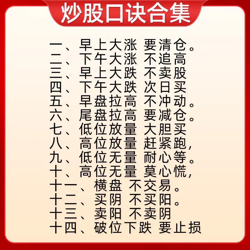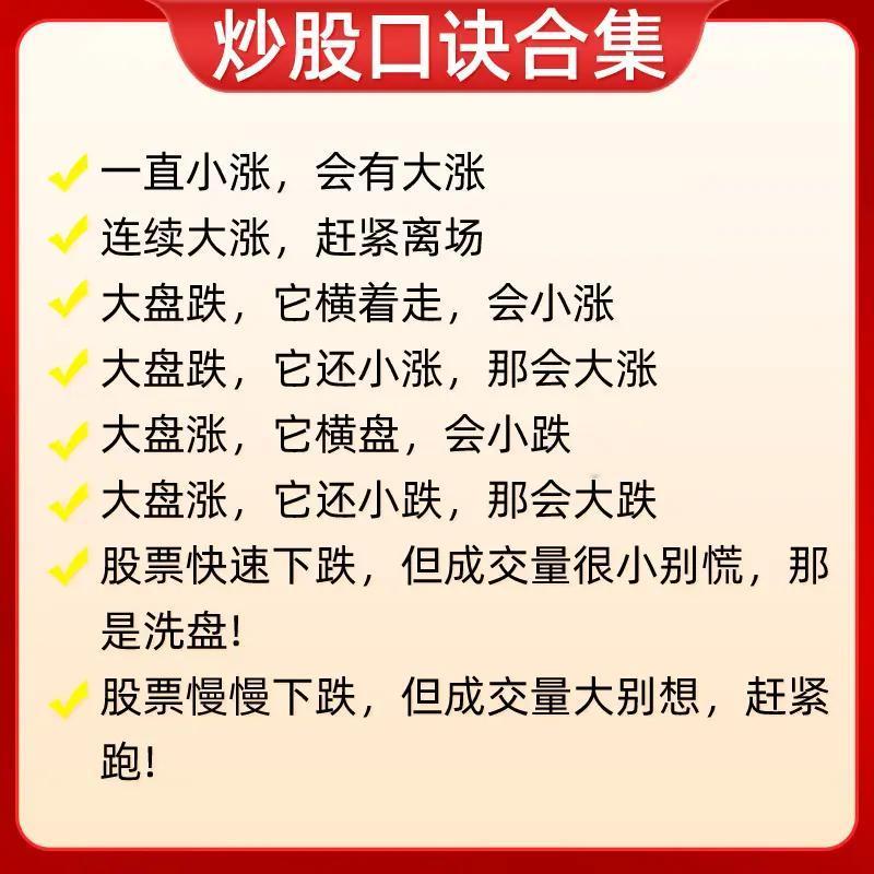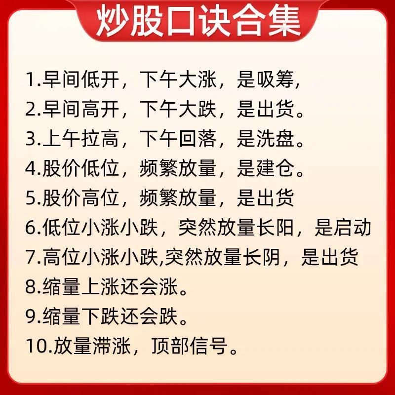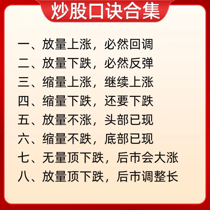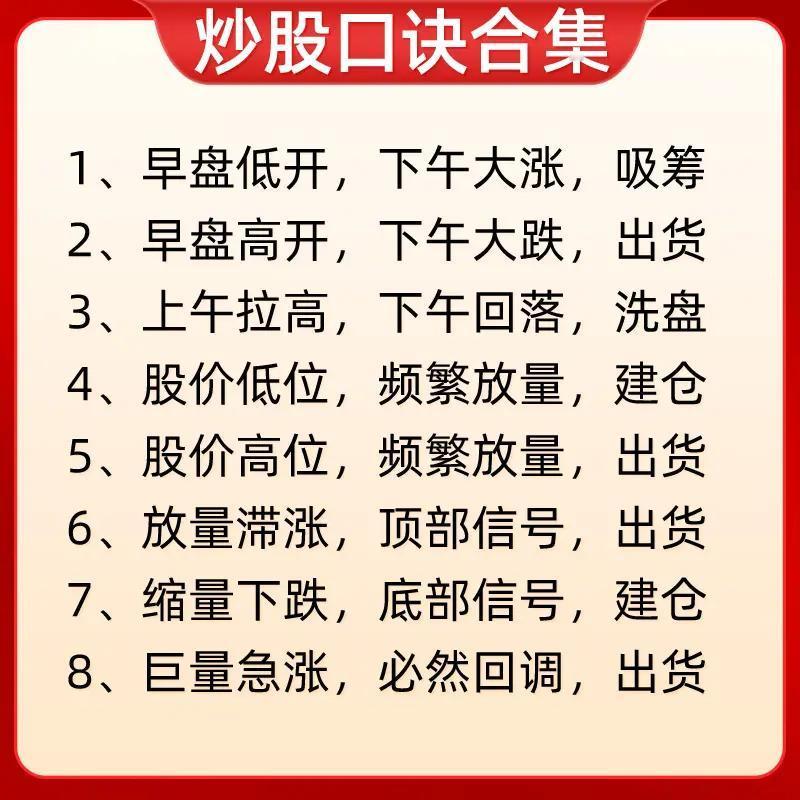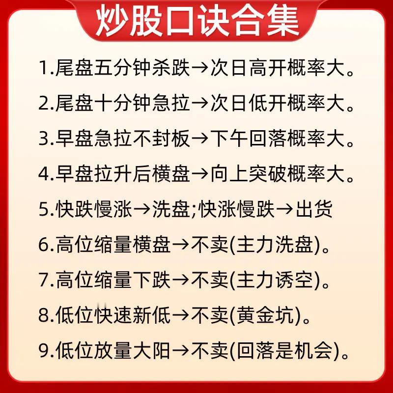“炒股口诀合集”: 第一张聚焦尾盘、早盘走势的概率判断及高低位量价形态操作:如尾盘五分钟杀跌次日高开概率大,早盘急拉不封板下午回落概率大;高位缩量横盘/下跌不卖(主力洗盘/诱空),低位快速新低/放量大阳不卖(黄金坑/回落是机会)等。 第二张涵盖自身走势与大盘对比及下跌量能解读:一直小涨会大涨、连续大涨需离场;大盘跌时横盘会小涨、小涨会大涨,大盘涨时横盘会小跌、小跌会大跌;快速下跌量小是洗盘,慢慢下跌量大需跑。 第三张围绕成交量与价格走势的关系:放量上涨必回调、放量下跌必反弹;缩量上涨继续涨、缩量下跌还要跌;放量不涨是头部、缩量不跌是底部;无量顶下跌后市大涨,放量顶下跌后市调整长。 第四张分析不同走势对应的操作性质:早间低开下午大涨是吸筹,早间高开下午大跌是出货;上午拉高下午回落是洗盘;低位频繁放量/突然放量长阳是建仓/启动,高位频繁放量/突然放量长阴是出货;缩量涨跌延续趋势,放量滞涨是顶部信号。 第五张侧重时间与涨跌的操作纪律:早上大涨清仓、下午大涨不追高;早上大跌不卖股、下午大跌次日买;早盘拉高不冲动、尾盘拉高减仓;低位放量大胆买、高位放量赶紧跑;低位无量耐心等、高位无量莫心慌;横盘不交易,买阴不买阳、卖阳不卖阴,破位下跌止损。 第六张结合均线(季线、月线、十日线、五日线)判断波段与买卖点:股价踩季线做波段,季线跌破有祸;月线上穿季买进获利,月线下行本波完成;价跌月线平底部探明,月线走平观望做空;十日线不破不走人,短线看五日破掉就斩。 第七张重申早盘走势性质与量价策略:早盘低开下午大涨是吸筹,早盘高开下午大跌是出货;上午拉高下午回落是洗盘;低位频繁放量建仓,高位频繁放量出货;放量滞涨是顶部信号需出货,缩量下跌是底部信号可建仓,巨量急涨必回调需出货。 整体来看,这些口诀从时间节点、量价配合、大盘联动、均线指标等多维度,为股民提供快速判断走势、识别主力意图及制定操作策略的参考,强调简洁易记的实战性。