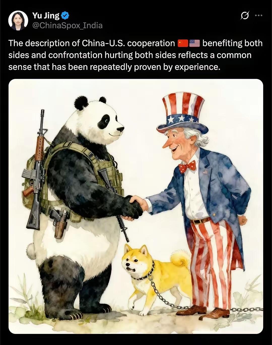 这位驻印度大使馆的工作人员就中日关系发文,称中美合则两利,斗则两伤,这是被一次次验证过的常识! 图文的配图立意简洁,让人一目了然,尤其是全副武装的熊猫和礼貌有加的山姆大叔握手寒暄!而山姆大叔牵着的那只秋田犬,则象征日本。 本子作为美国的跟班,狗链子拴着!看来狗子终究是狗,,从来没有被当成人看!