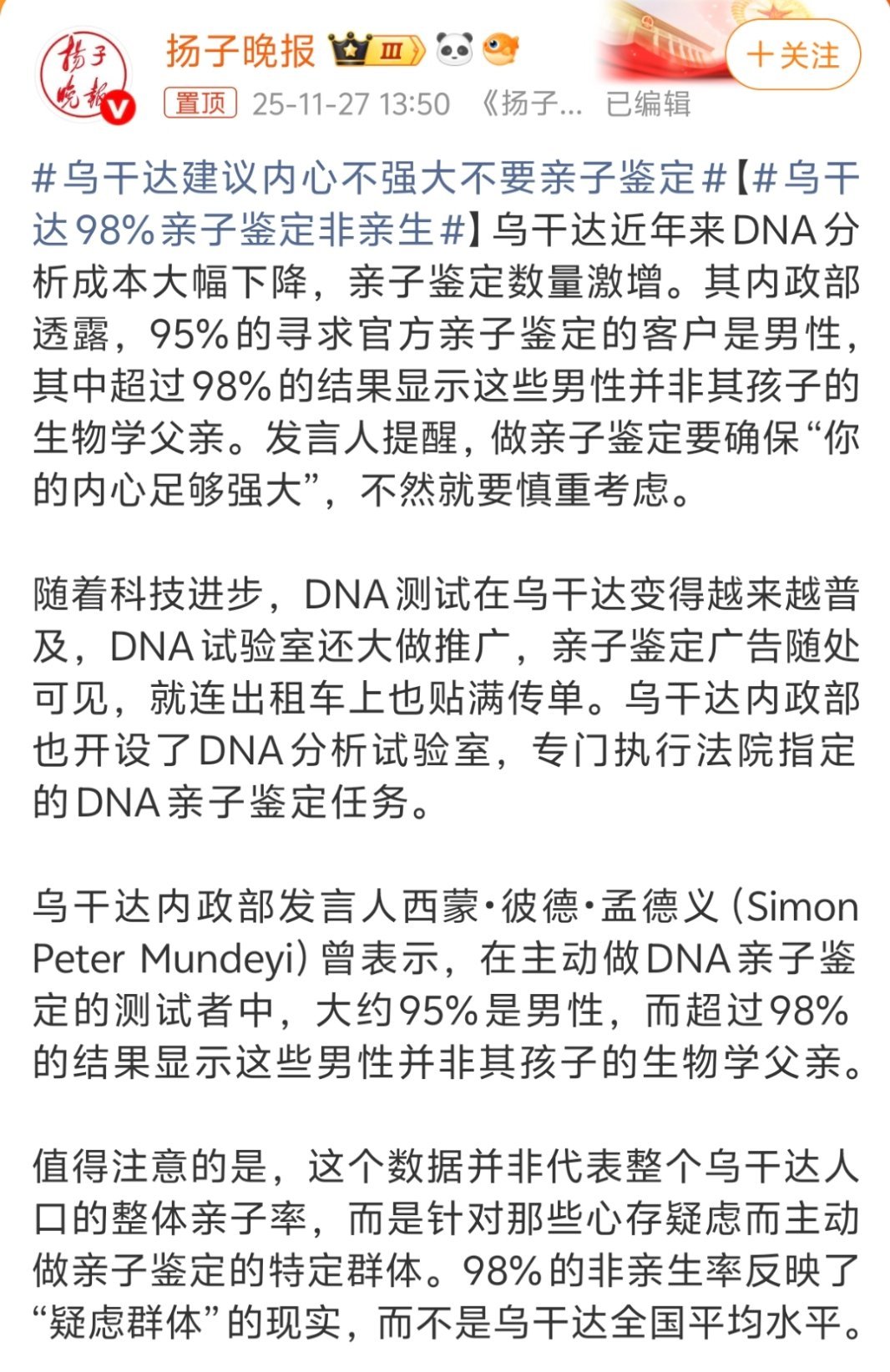 乌干达98%亲子鉴定非亲生一般能去做亲子鉴定的,本身就是很怀疑的了,不过这98%也有点过高了吧。