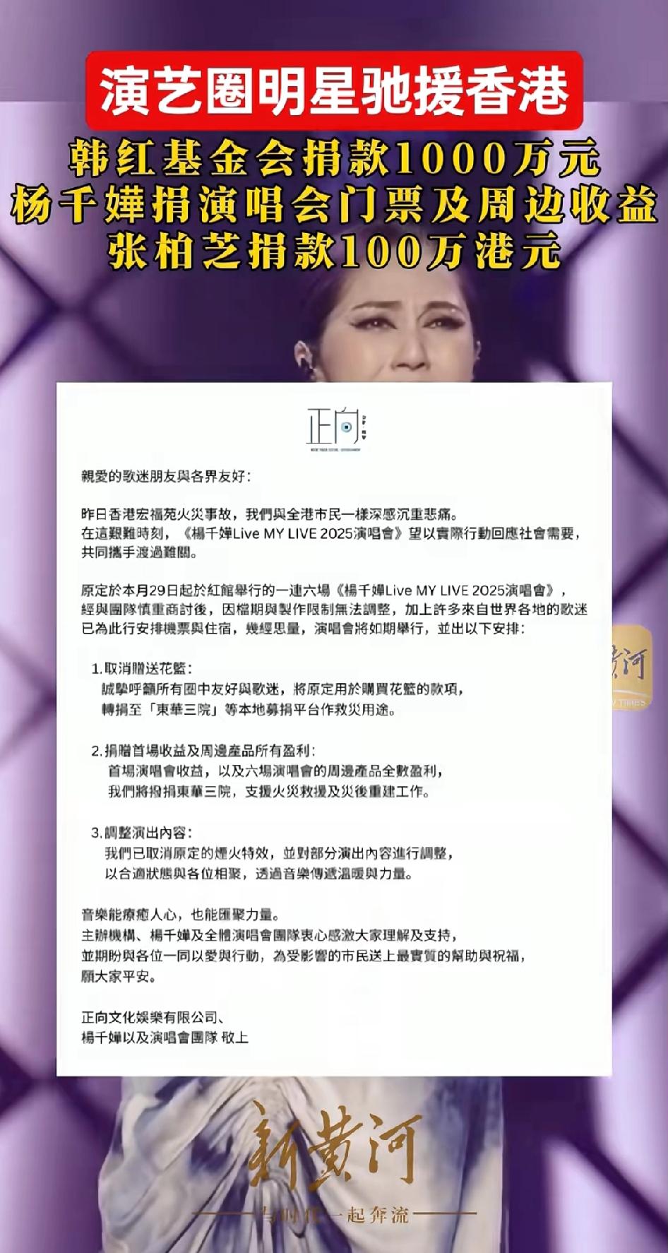两岸三地明星捐款启动: 韩红基金会捐款1000万; 周深通过上海复星公益基金会捐款100万元用于灾后救援; 杨千嬅捐赠第一场演唱会的收入并且捐赠演唱会周边商品收益; 张柏芝通过香港保良局捐赠100万港元; 韩国SM娱乐公司捐赠100万港元; 目前来看,明星启动似乎有点慢啊!